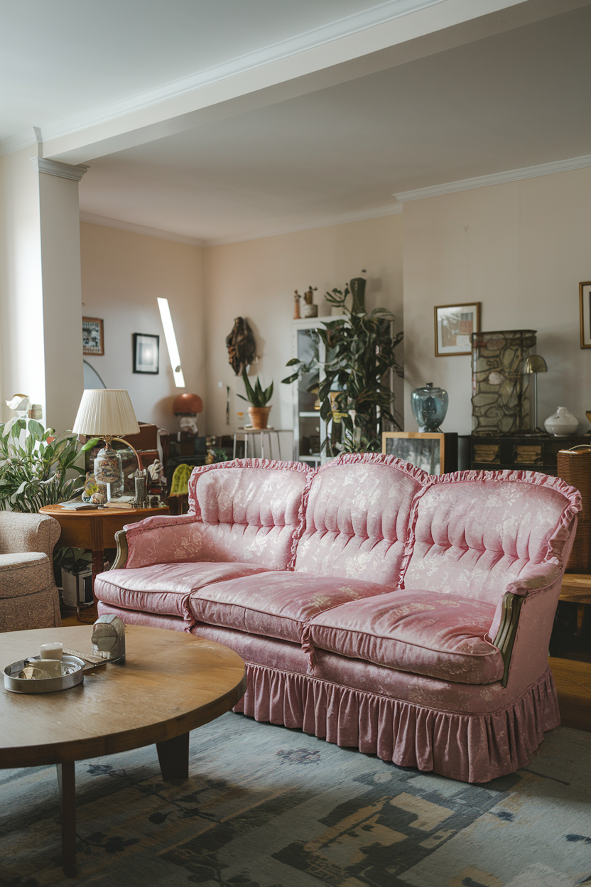 For lovers of vintage style, a retro-inspired pink sofa with floral patterns, ruffled edges, or tufted detailing brings an old-world charm to your living room. The vintage design exudes character and nostalgia, creating a sense of timeless elegance. The soft pink color adds warmth and sweetness to the retro aesthetic, making the piece feel fresh and modern while retaining its vintage appeal. This type of sofa is perfect for creating a romantic, cozy atmosphere with a touch of old-school glamour.
