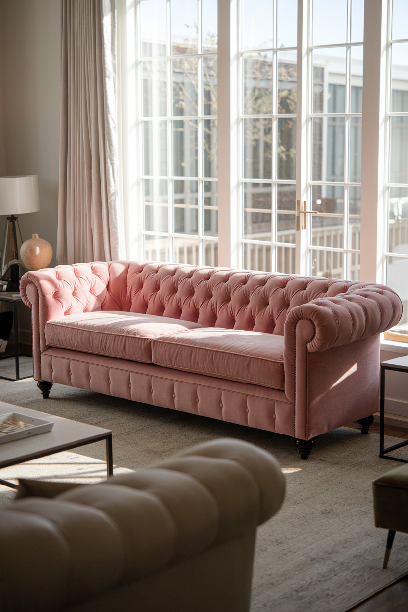 The Chesterfield sofa, known for its deep button tufting, rolled arms, and timeless design, takes on a fresh and modern twist when upholstered in a vibrant pink fabric. This sophisticated piece adds an air of classic elegance to your living room while the pink hue brings a contemporary touch. The combination of rich texture and bold color creates a striking visual contrast, ensuring that the sofa remains a statement piece in any room. Pair this style with antique or vintage accessories for an added sense of grandeur.