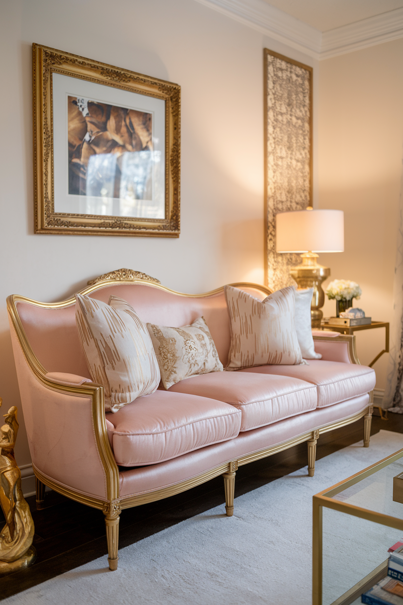 A blush pink sofa with gold accents elevates any living room into a glamorous, chic retreat. The soft blush fabric paired with gold trim, decorative throw pillows, or gold-framed artwork creates a harmonious, luxurious space. The gold elements introduce a refined contrast to the gentle tones of the pink sofa, offering sophistication and warmth. This style is perfect for those who love a bit of opulence without going overboard.