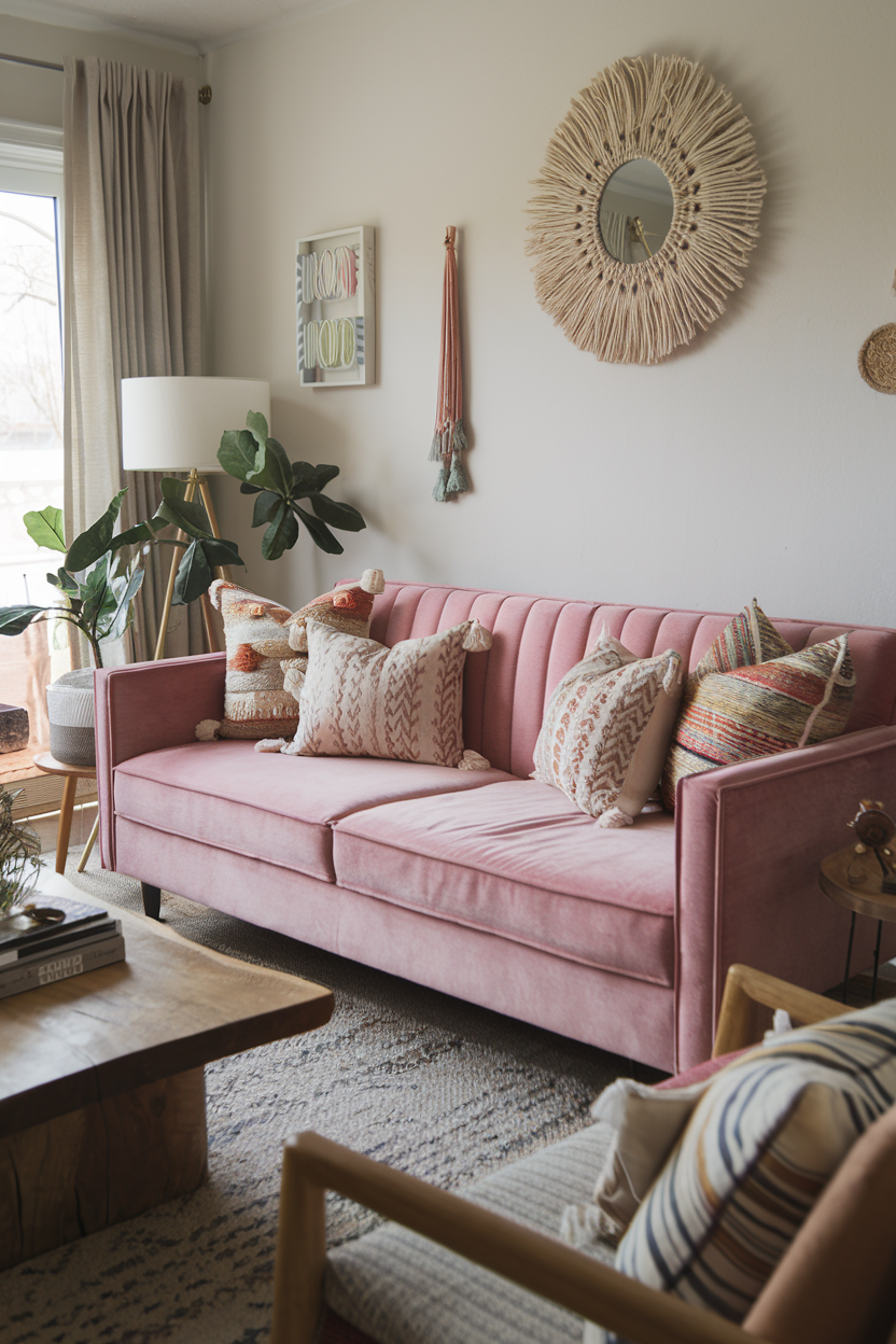 For a boho-chic vibe, a pink sofa adorned with an eclectic mix of colorful patterned pillows adds personality and a sense of playfulness to the living room. The soft pink hue provides a neutral foundation that allows the vibrant colors and textures of the pillows to pop, creating a space full of energy and creativity. This style is perfect for individuals who want to express their unique style through decor, combining comfort with a laid-back, inviting atmosphere.