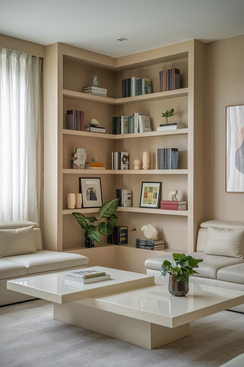 If your living room also serves as a home office or creative space, make use of corner furniture that’s multi-functional. Consider a corner desk with built-in shelving or a modular piece that serves as both seating and storage. The goal is to design a corner that’s both practical and stylish, allowing you to maximize the use of space without compromising on design. This type of corner setup keeps the area organized and efficient, while seamlessly blending into your living room’s aesthetic.