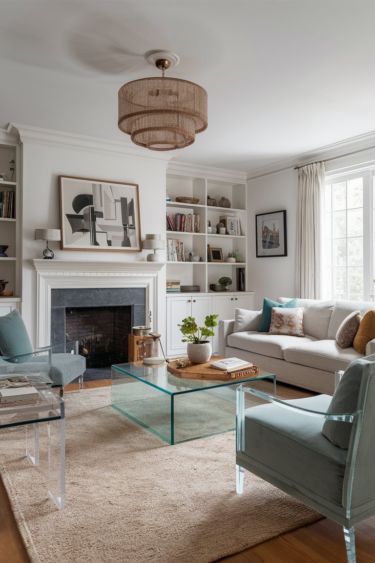 Transparent or glass furniture, such as acrylic coffee tables, glass side tables, or clear chairs, can make a small living room feel more open and airy. These pieces don’t block the visual flow of the room, allowing light to pass through and making the space appear larger. Transparent furniture is also a great way to add a modern, minimalist touch to your living room without overwhelming the space. Plus, it’s easy to pair with a variety of decor styles, from contemporary to traditional.