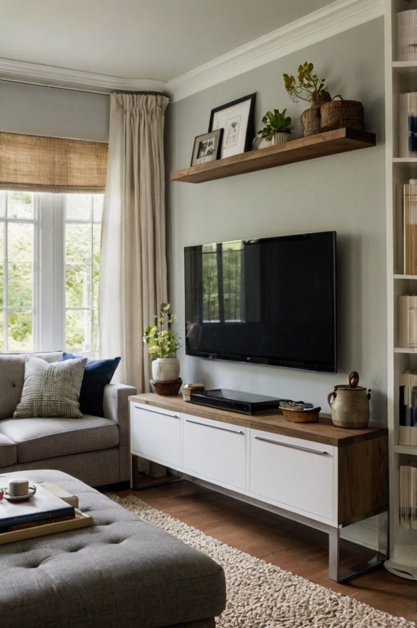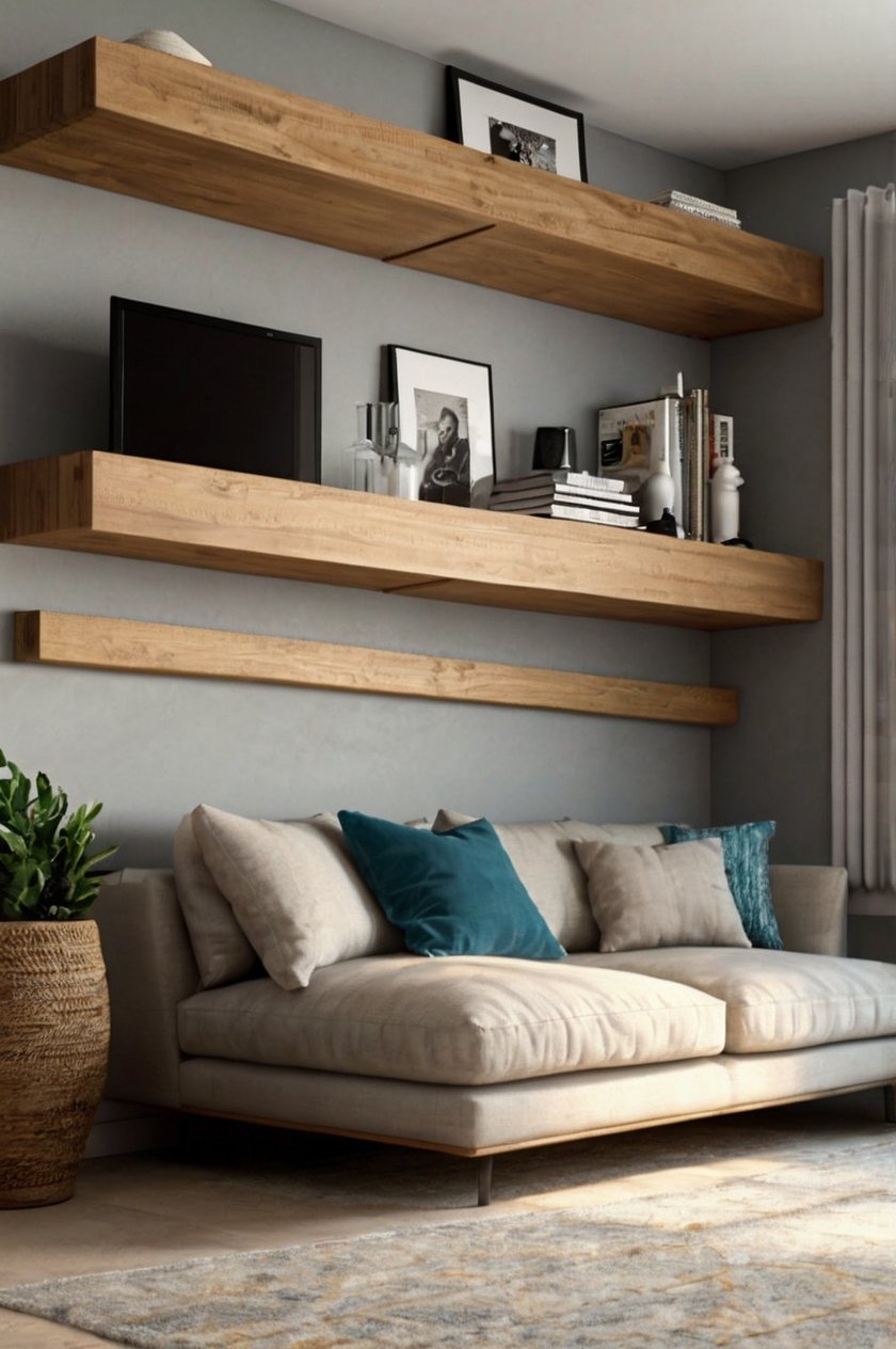 Floating furniture, such as wall-mounted shelves, cabinets, or even a floating TV stand, can free up floor space and make the room feel less cluttered. By keeping furniture off the floor, you create a sense of openness and allow for more flexibility in how you use the space. Floating shelves or cabinets are also great for displaying decor, books, or media equipment without taking up valuable floor space.
