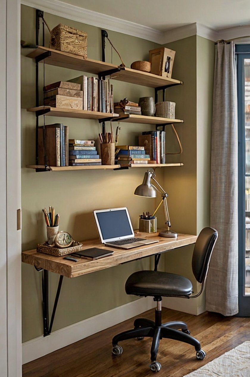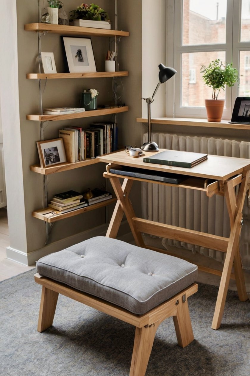 If your small living room doubles as a work-from-home space, consider adding a fold-down desk. This space-saving solution allows you to create a functional workspace that can be tucked away when not in use. A wall-mounted fold-down desk can be paired with a foldable chair to create a convenient office nook, perfect for small rooms. When not in use, the desk can be folded up, leaving your living area clutter-free.