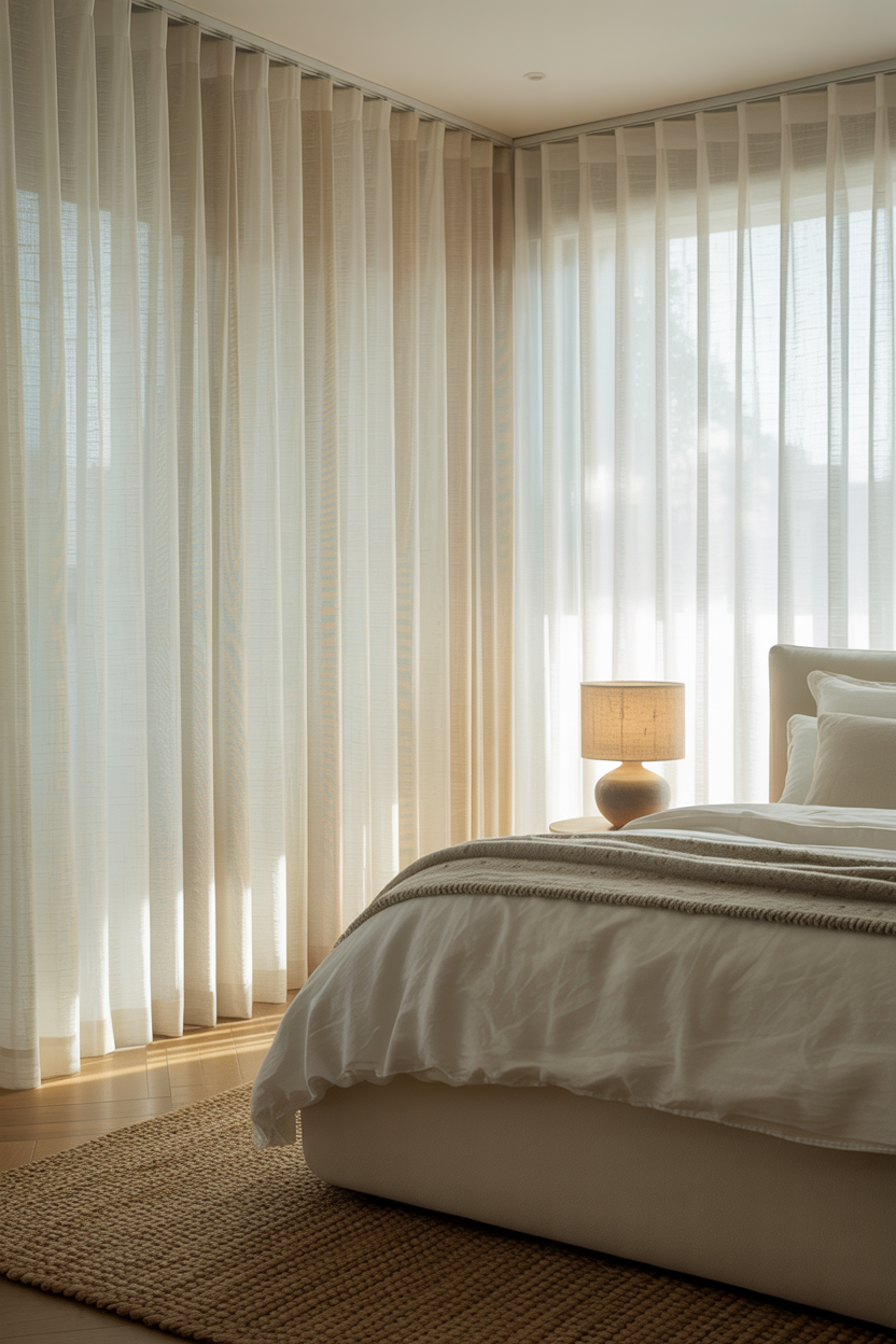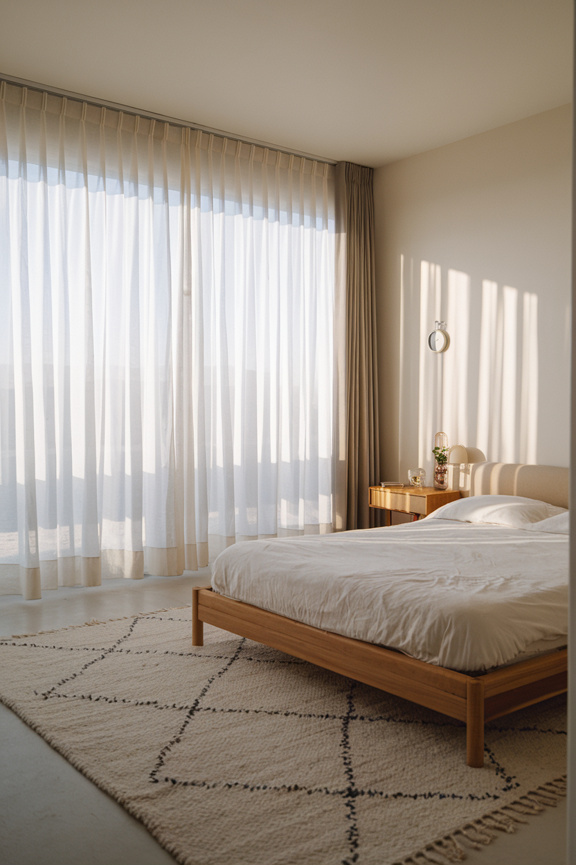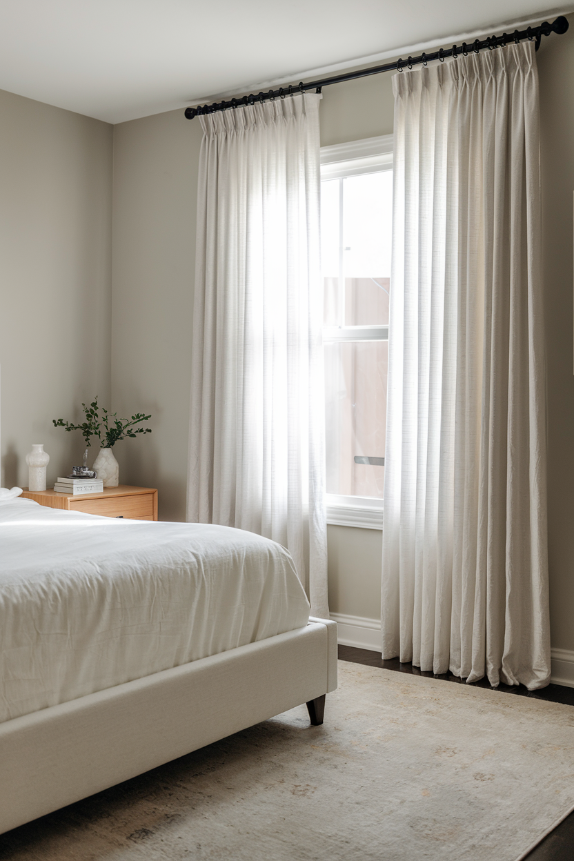 Nothing beats the timeless elegance of white sheer curtains. These lightweight, flowy panels let in plenty of natural light while still offering a sense of privacy. Their translucent quality gives your bedroom an ethereal, dreamy ambiance, making the space feel open and serene. Sheer curtains work particularly well in minimalist, Scandinavian, or coastal-style bedrooms, where a bright and breezy atmosphere is essential. To enhance the effect, pair them with natural elements like rattan furniture, linen bedding, or soft, neutral-toned decor. If you want more privacy in the evening, layer sheer curtains over blackout or solid drapes to get the best of both worlds.
