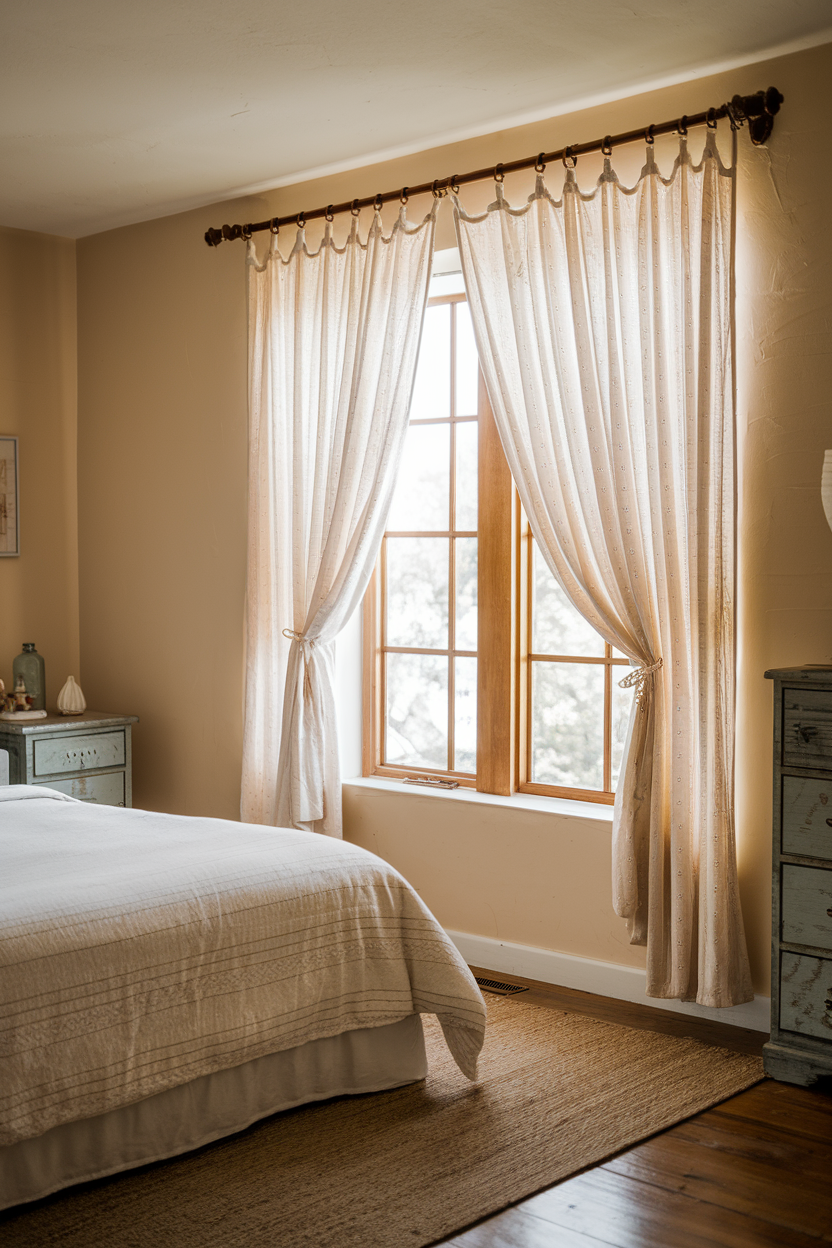 Tie-top curtains bring a charming, laid-back vibe to any bedroom. Instead of standard curtain hooks or grommets, these curtains have fabric ties that loop around the curtain rod, creating a delicate, handmade feel. They’re perfect for French country, cottagecore, or shabby chic bedroom styles, as their soft, gathered look adds an extra touch of warmth. Lightweight fabrics like linen or cotton work best for tie-top curtains, as they drape effortlessly and allow plenty of natural light to filter through. For an extra cozy aesthetic, choose curtains in soft pastels, floral prints, or washed-out neutrals. If you want a more rustic touch, try frayed-edge tie-top curtains paired with a wooden or wrought iron curtain rod.
