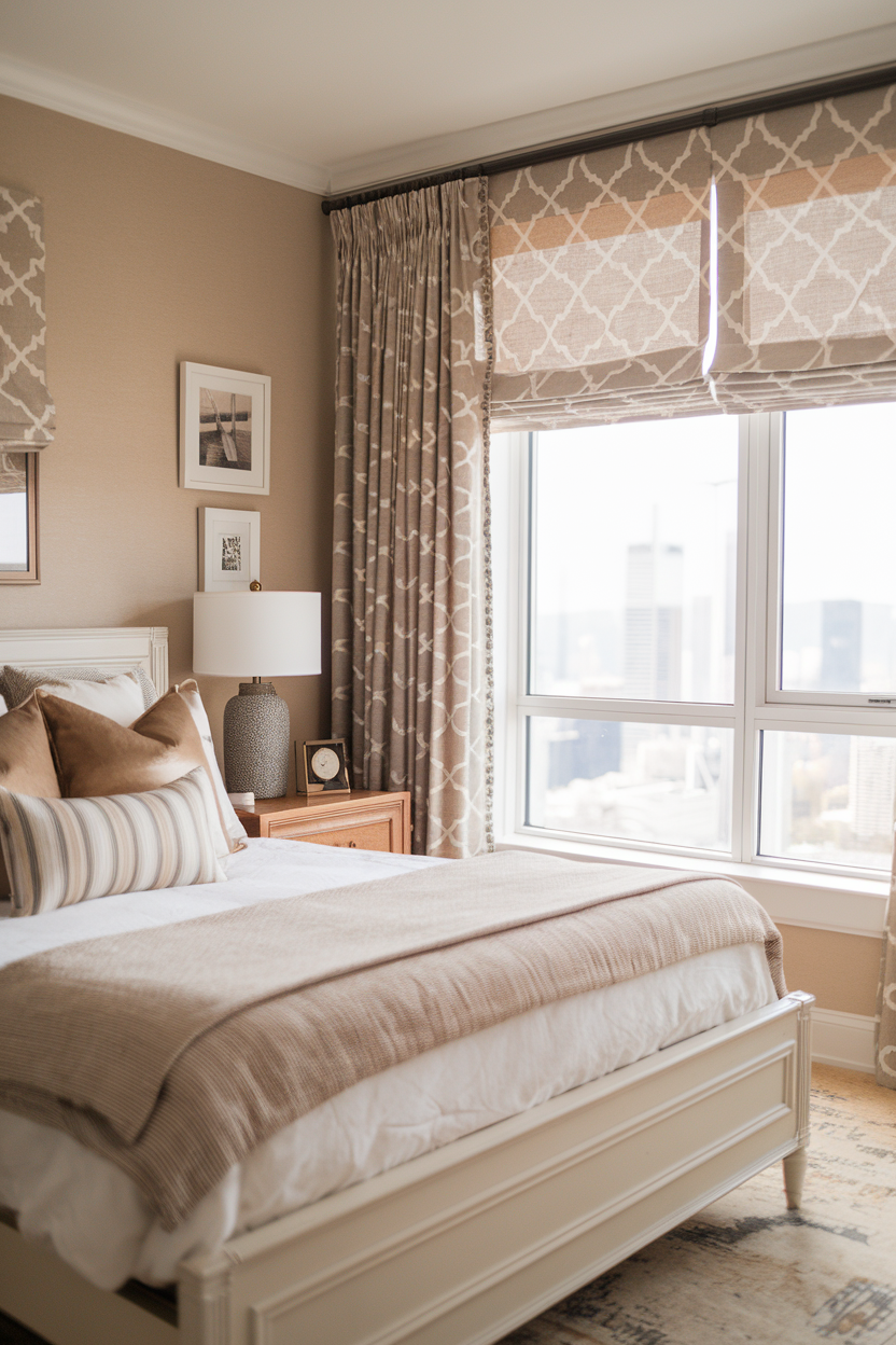 If you prefer a clean and sophisticated window treatment, Roman shades are an excellent choice. Unlike traditional curtains, these fabric shades fold into neat, horizontal pleats when raised, giving your bedroom a polished, structured appearance. They’re perfect for small spaces where long, flowy curtains might feel overwhelming. Roman shades come in a variety of fabrics, from lightweight cotton to luxurious silk, allowing you to tailor them to your decor style. Choose neutral linen shades for a modern and minimalist aesthetic, or opt for patterned ones with floral or geometric prints for a bit of character. Some Roman shades also have blackout lining, making them a stylish and practical option for better sleep.