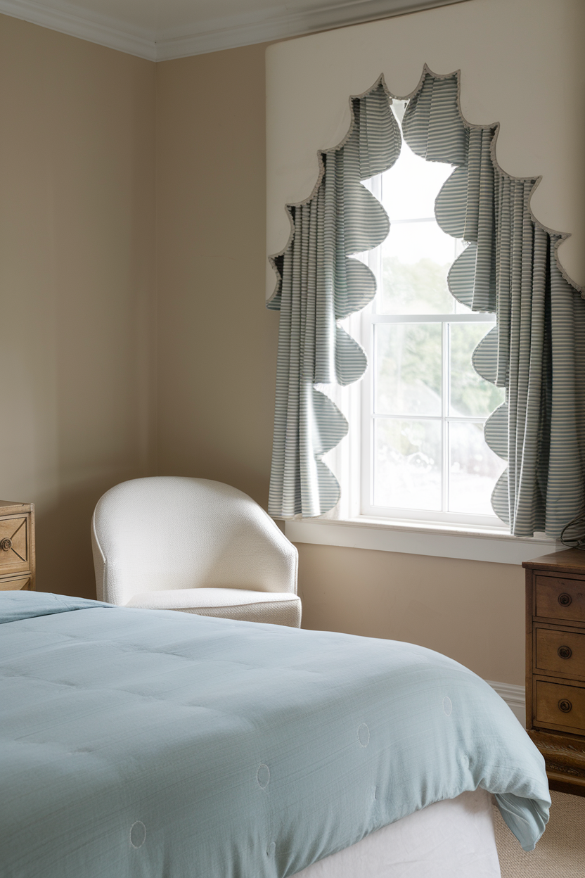 Scalloped curtains, with their soft, curved edges, add a romantic and whimsical feel to your bedroom. This elegant design detail creates a more refined and decorative look, making the curtains a standout feature in the space. Scalloped edges are often accented with lace, embroidery, or contrast piping, enhancing their delicate beauty. These curtains work beautifully in vintage-inspired, French provincial, or romantic farmhouse bedrooms. For an extra dreamy ambiance, pair them with layered bedding, ornate furniture, and soft, muted colors like blush pink, lavender, or cream. If you prefer a modern twist, go for neutral scalloped curtains with subtle detailing that complements a contemporary aesthetic.