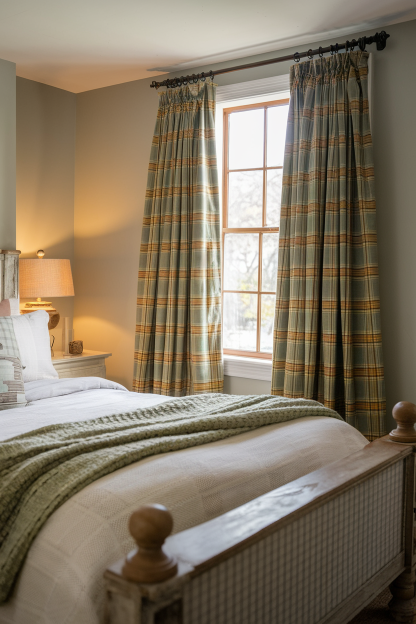 Plaid and gingham curtains instantly create a cozy, nostalgic atmosphere reminiscent of a charming countryside retreat. These classic patterns work well in rustic, farmhouse, or traditional-style bedrooms, adding a sense of warmth and comfort. Choose muted earth tones like sage green, mustard yellow, or soft gray for a subtle, cozy effect, or opt for classic black-and-white gingham for a crisp and timeless look. To enhance the cozy ambiance, pair plaid or gingham curtains with vintage wooden furniture, knit blankets, and warm lighting. If you want a more modern touch, balance the patterned curtains with neutral bedding and sleek decor.