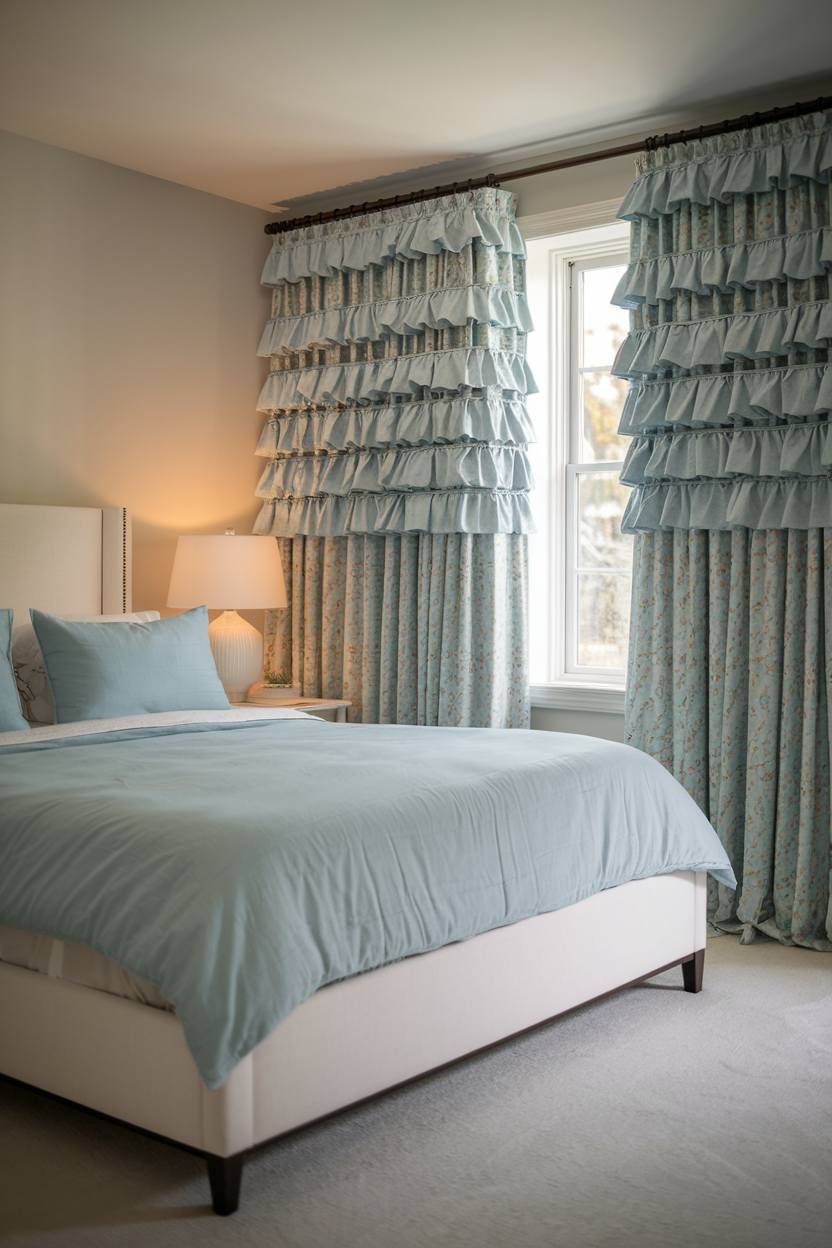 Ruffled curtains exude charm, elegance, and vintage appeal, making them ideal for shabby chic, cottagecore, or French country bedroom designs. The cascading layers of ruffles add volume and movement, creating a soft and dreamy aesthetic. These curtains work beautifully in pastel hues like blush pink, ivory, or light lavender for a delicate touch, but they can also be styled in deeper shades for a more dramatic effect. Pair them with floral bedding, vintage-inspired furniture, and ornate mirrors to complete the romantic look. If you want to modernize ruffled curtains, opt for subtle, structured ruffles rather than overly frilly designs.