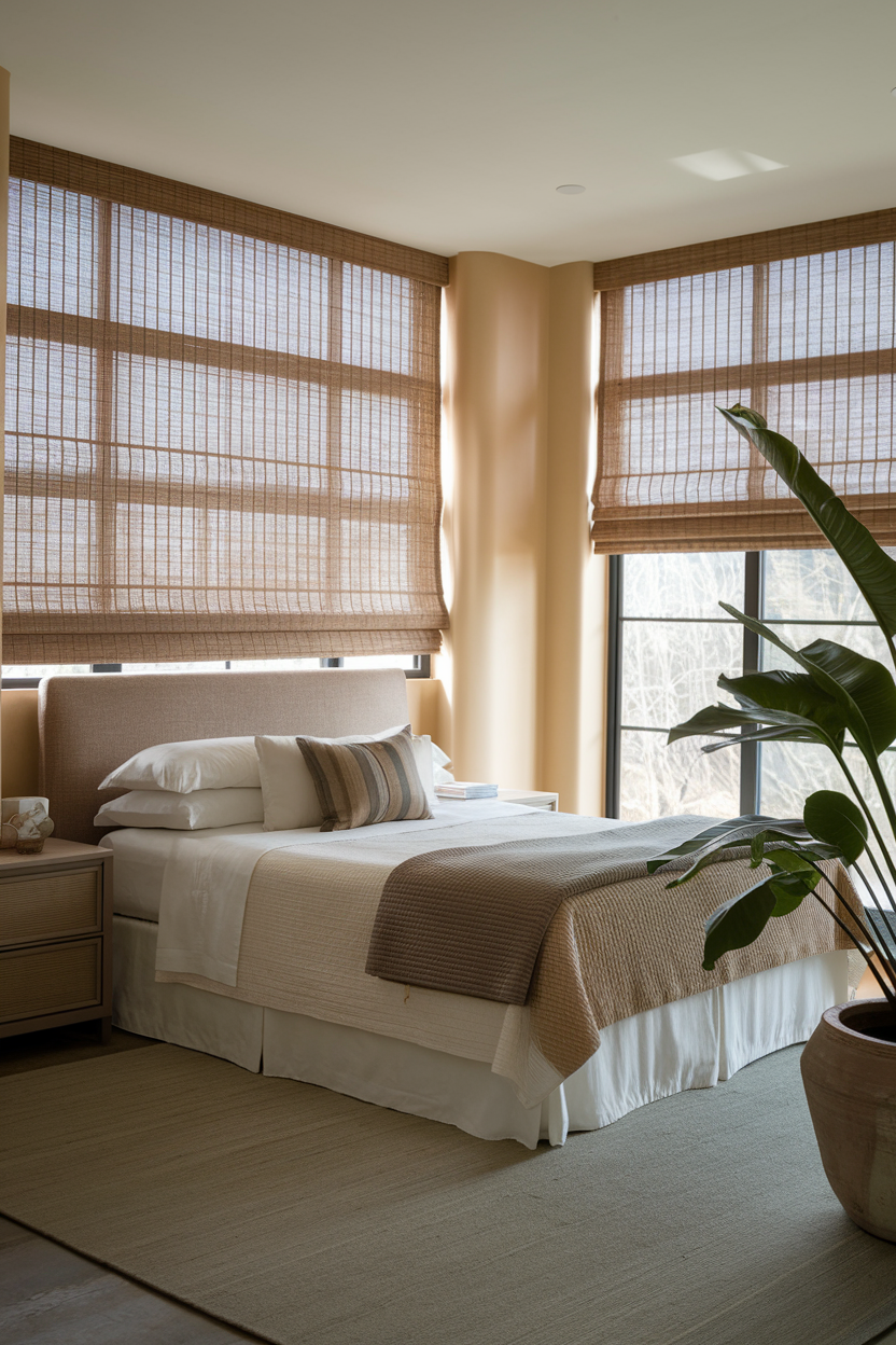 For a bedroom inspired by nature, bamboo or woven wood shades are an excellent alternative to traditional fabric curtains. These eco-friendly window treatments add warmth and texture to the space while providing a relaxed, organic aesthetic. Bamboo shades work well in bohemian, coastal, or Scandinavian-style bedrooms, complementing natural materials like wood, rattan, and stone. They allow filtered sunlight to enter during the day, creating a soft and inviting glow. If privacy is a concern, you can pair bamboo shades with sheer curtains or opt for lined versions that block out more light. Their earthy tones (ranging from honey brown to deep espresso) add richness and depth to your bedroom decor.