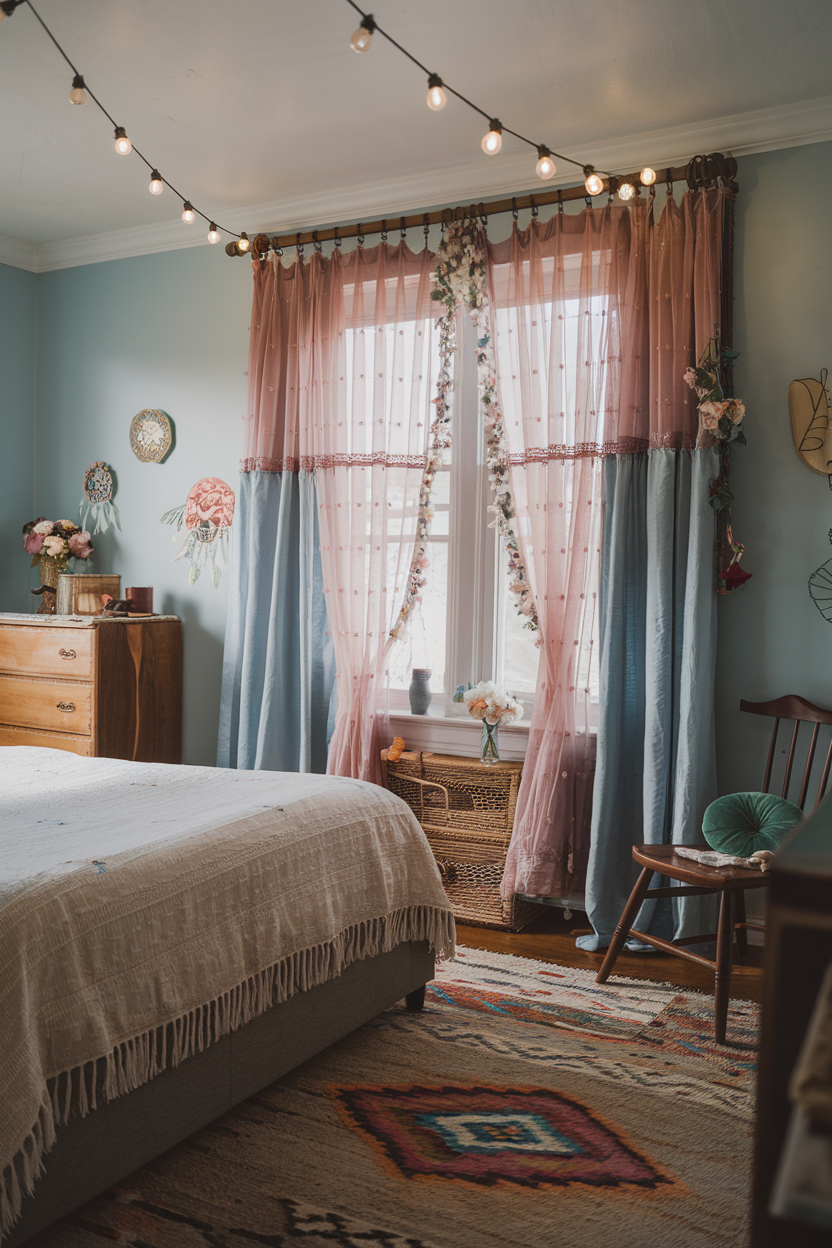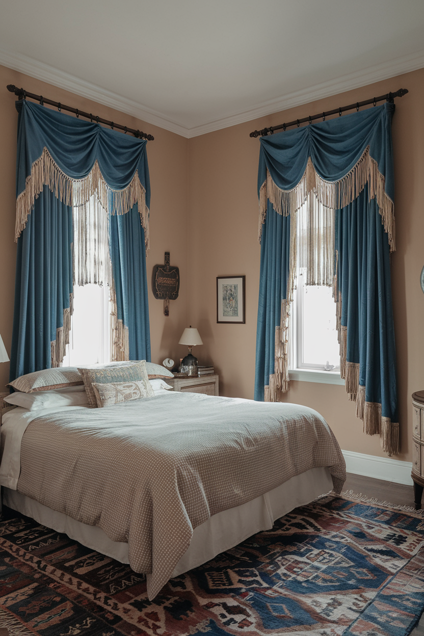 For a playful and artistic touch, opt for curtains adorned with tassels or fringe details. These decorative elements add a bohemian, free-spirited feel to your bedroom, making it feel more relaxed and inviting. Tassel-trimmed curtains come in various styles, from simple white linen with macramé edging to colorful, globally inspired prints with intricate beaded tassels. If you love a travel-inspired or eclectic aesthetic, mix and match different patterns and textures to enhance the boho vibe. Complement these curtains with woven rugs, embroidered pillows, and rattan furniture to complete the look.