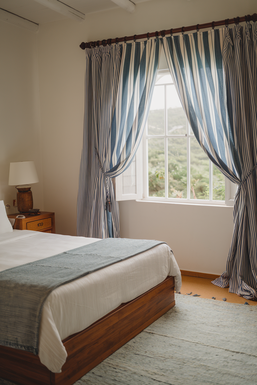 Striped curtains add a structured yet stylish touch to any bedroom, offering a balance between classic and contemporary aesthetics. Vertical stripes create the illusion of taller windows, making the room feel more spacious, while horizontal stripes can add a bold, graphic element. Neutral-toned stripes in beige, gray, or soft blue work well for a subtle and sophisticated look, while black-and-white stripes create a striking, modern contrast. Striped curtains pair well with both minimalist and eclectic decor, allowing you to mix patterns and textures without overwhelming the space. For an extra polished appearance, choose curtains with evenly spaced, crisp stripes and high-quality fabric.