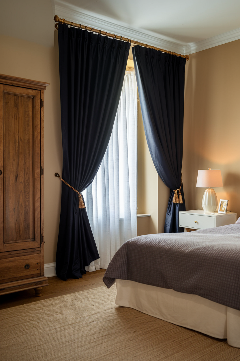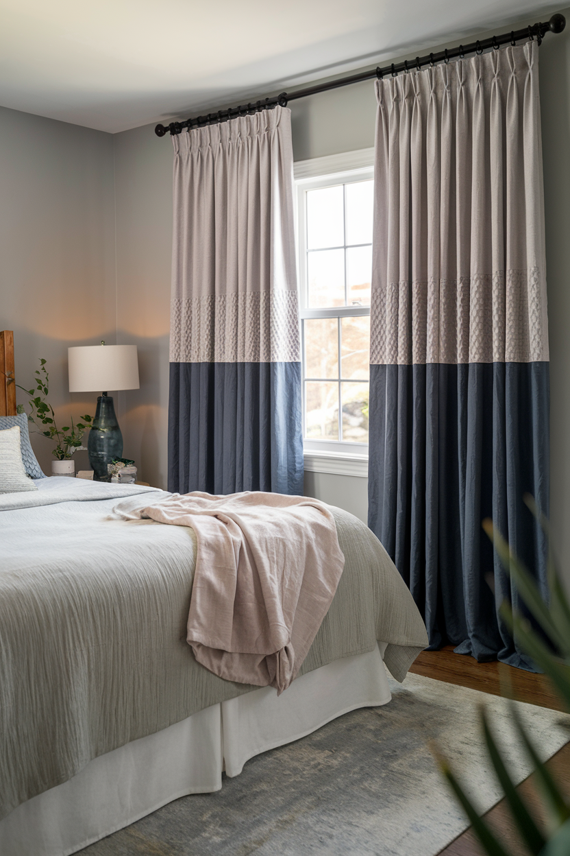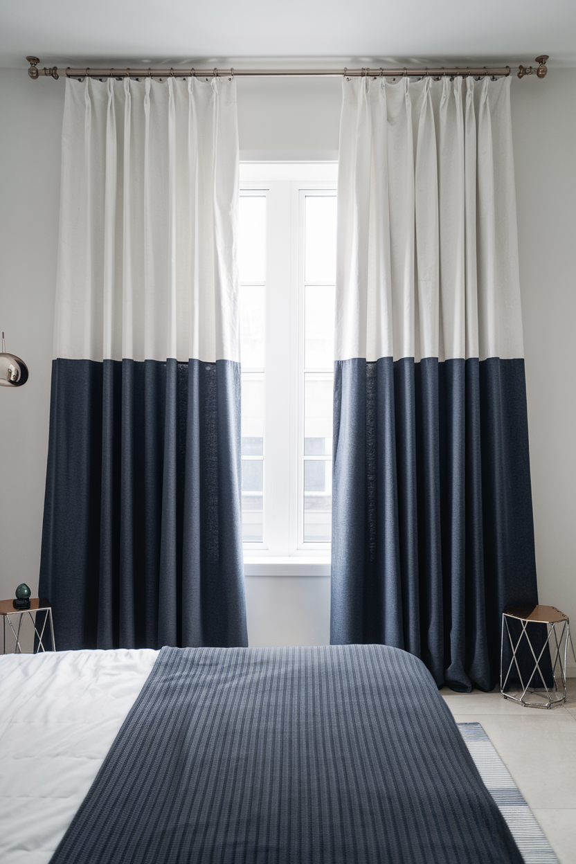 Two-tone curtains add a striking visual contrast to your bedroom while maintaining a balanced, sophisticated aesthetic. This style features two complementary colors, often a darker shade on the bottom and a lighter shade on top, to create an elegant gradient effect. It works exceptionally well in modern or transitional spaces where a refined yet eye-catching design is desired. Choose colors that match your existing decor, such as navy and white for a nautical feel or blush and gray for a soft, romantic ambiance. To enhance the impact, pair these curtains with minimalist furniture and metallic accents for a stylish, contemporary look.