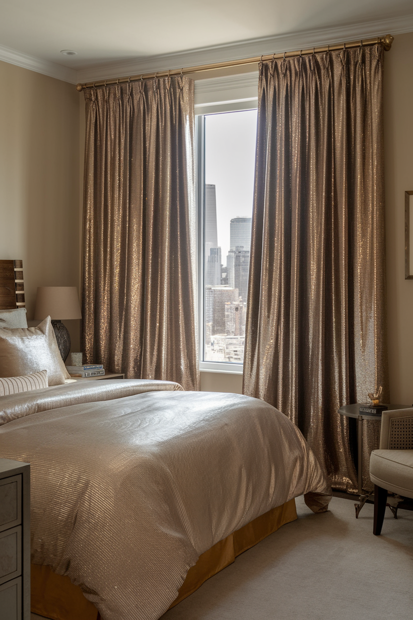 For those who love a bit of luxury and drama, metallic or shimmery curtains can bring an opulent feel to the bedroom. Whether it’s a subtle sheen in soft gold, silver-threaded linen, or full-on sequinned drapes, metallic curtains instantly elevate the space. They work particularly well in glam, Art Deco, or Hollywood-inspired interiors. If you want a softer effect, opt for satin-finish curtains in champagne, rose gold, or muted bronze tones. Pair these glamorous curtains with plush bedding, crystal lighting, and mirrored furniture to create a truly sophisticated retreat.