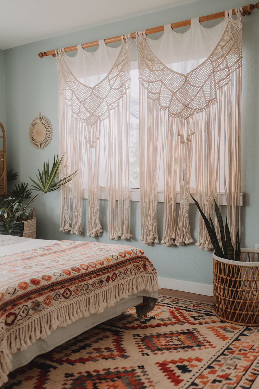 Macramé or crochet curtains add a handcrafted, artistic feel to the bedroom, making them perfect for bohemian or eclectic decor styles. These intricately woven designs allow light to pass through while creating a beautiful play of shadows. Macramé curtains work particularly well in spaces filled with plants, rattan furniture, and earthy tones, enhancing the cozy and relaxed vibe. If you want a more subtle look, choose off-white or beige macramé panels; for a bold statement, go for deep-colored yarn or dyed crochet patterns. These curtains can also double as decorative room dividers, adding charm to open-concept bedrooms.