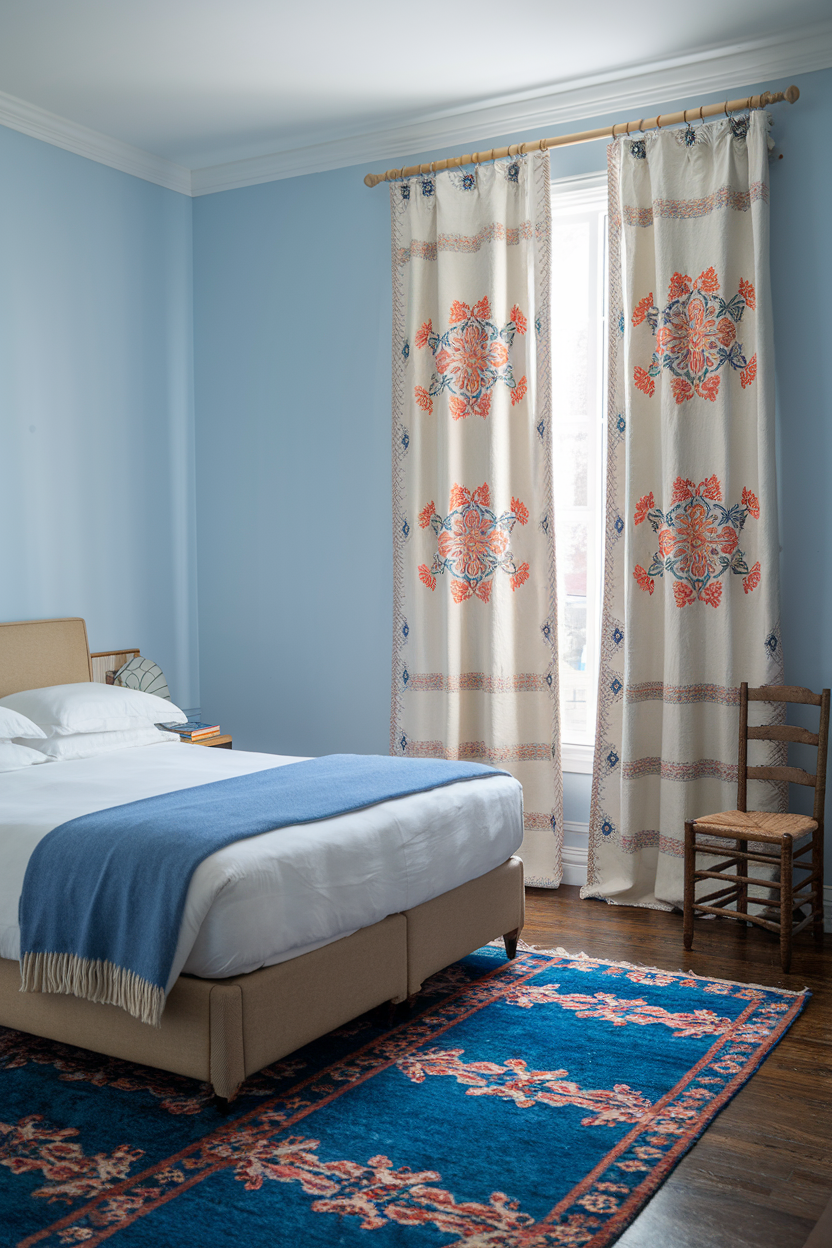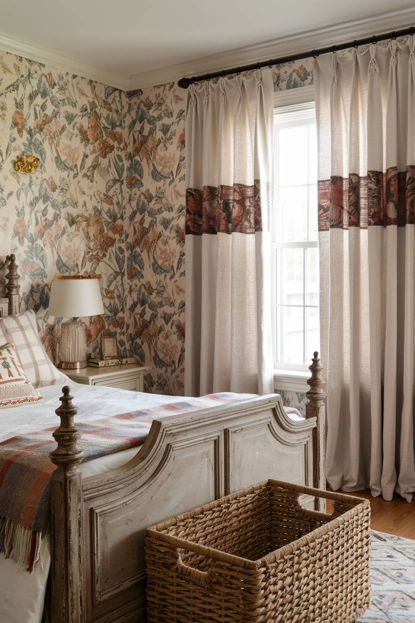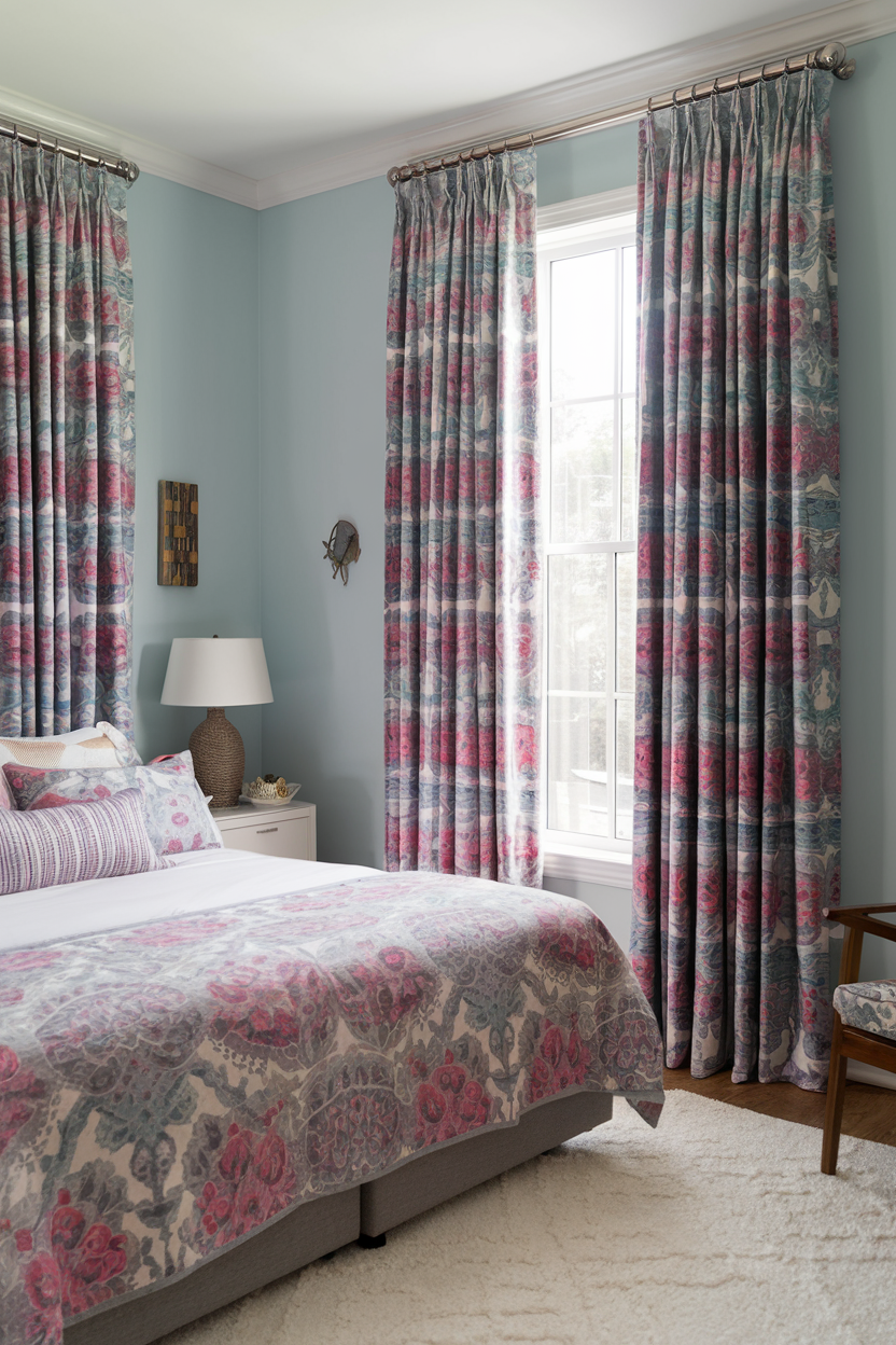 If you want to introduce some personality into your bedroom, patterned curtains are a great way to do it. Whether you opt for floral prints, geometric designs, or abstract motifs, a well-chosen pattern can become the focal point of your space. Floral curtains add a soft, feminine touch, perfect for vintage, shabby chic, or cottagecore interiors. Geometric prints, on the other hand, bring a contemporary and structured vibe, making them ideal for modern or mid-century bedrooms. If you’re hesitant about committing to bold patterns, try a subtle print in neutral colors or a tone-on-tone design for a more understated effect. To balance the look, keep the rest of your bedding and decor relatively simple.