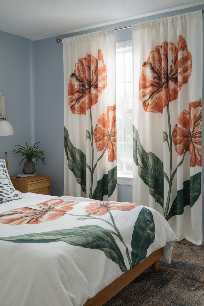 Floral or botanical-printed curtains instantly breathe life into a bedroom by bringing in elements of nature. Whether featuring delicate vines, oversized tropical leaves, or watercolor florals, these curtains add a fresh, organic feel to the space. Light pastel shades create a soft and romantic ambiance, while bold green or deep blue hues make a striking statement. To enhance the natural vibe, complement these curtains with wooden furniture, potted plants, and earthy decor accents.