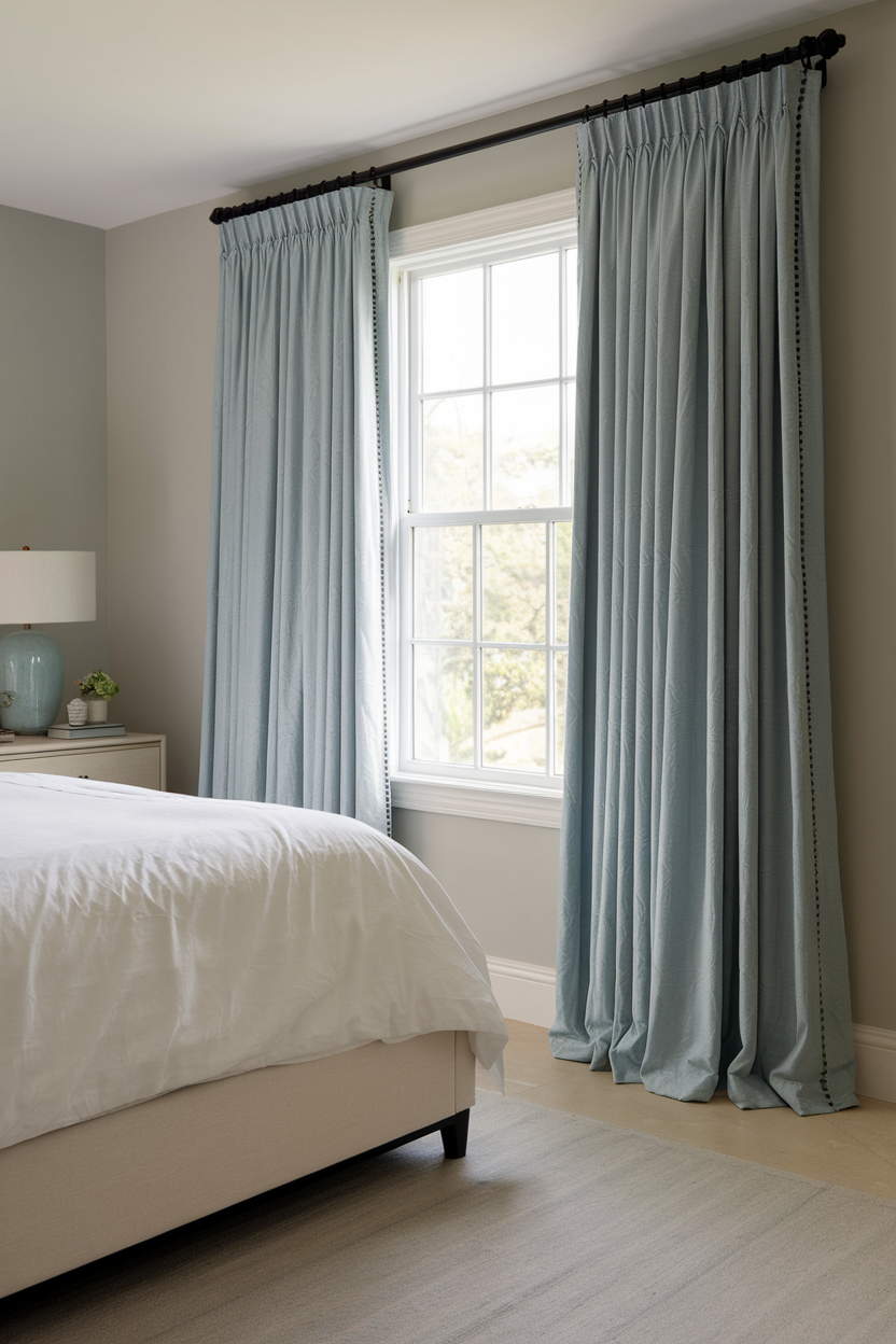 Pintuck curtains feature small, stitched folds that create a subtle yet elegant texture. These curtains add depth and visual interest without being too bold, making them perfect for modern, transitional, or classic bedroom styles. Pintuck details work exceptionally well on soft, lightweight fabrics like cotton or voile, allowing the pleats to drape gracefully. Opt for neutral hues such as ivory, gray, or soft blue to maintain a sophisticated and calming aesthetic. To complete the look, pair pintuck curtains with matching pintuck bedding for a cohesive and stylish bedroom design.
