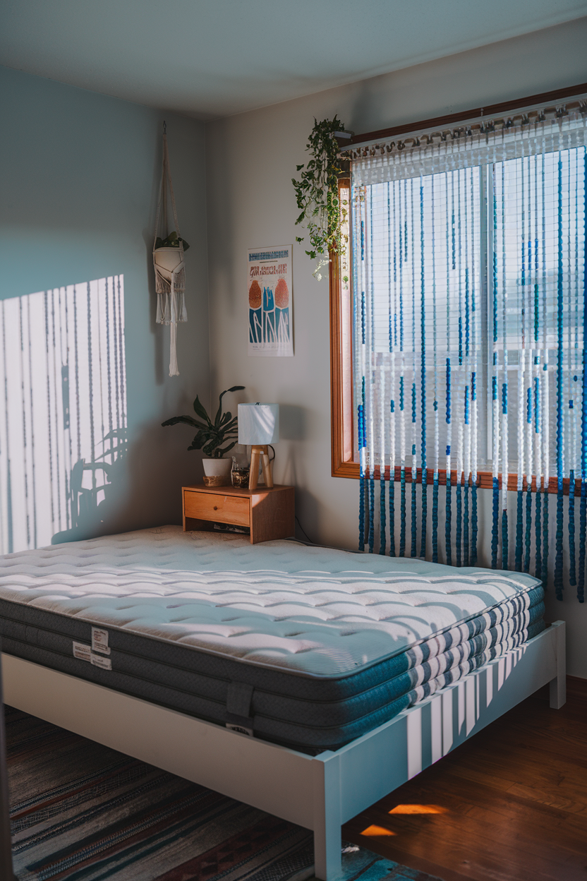 Beaded curtains offer a playful and unconventional alternative to fabric curtains. They add a free-spirited, artistic vibe to any bedroom, making them perfect for bohemian or eclectic decor styles. Available in wood, glass, or acrylic beads, these curtains create a soft, mesmerizing effect when light passes through them. Use them as a window treatment or even as a creative room divider. If you prefer a more subtle look, opt for neutral-colored beads, while multicolored designs add a fun and vibrant touch. Pair beaded curtains with woven rugs, macramé wall hangings, and layered textiles for a fully boho-chic space.