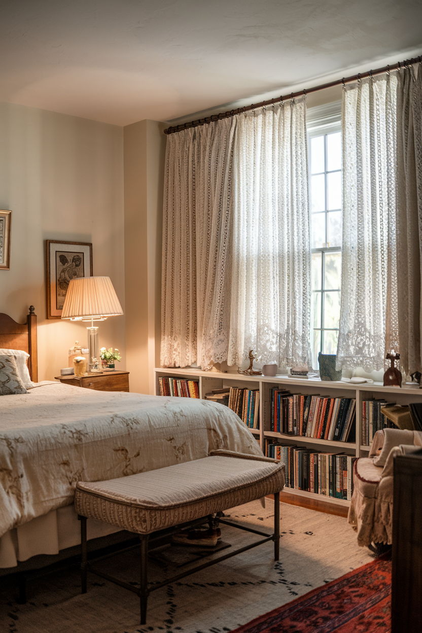 Lace curtains bring an old-world charm and timeless beauty to a bedroom. Their delicate, intricate patterns allow filtered light to enter, creating a soft, romantic glow. Perfect for French country, Victorian, or shabby chic decor styles, lace curtains pair well with vintage furniture, floral bedding, and ornate decor pieces. White or cream lace curtains offer a classic and elegant feel, while colored lace can add a unique and artistic touch. If you want to make them more functional, layer lace curtains over blackout panels to enjoy both beauty and practicality.
