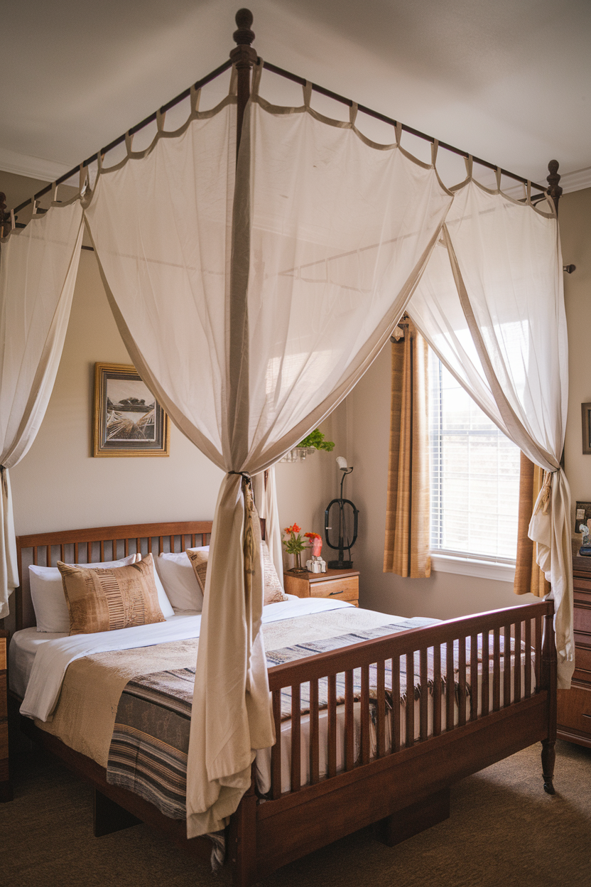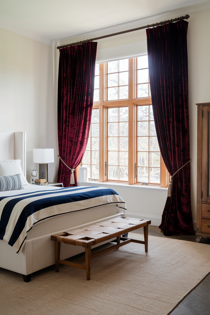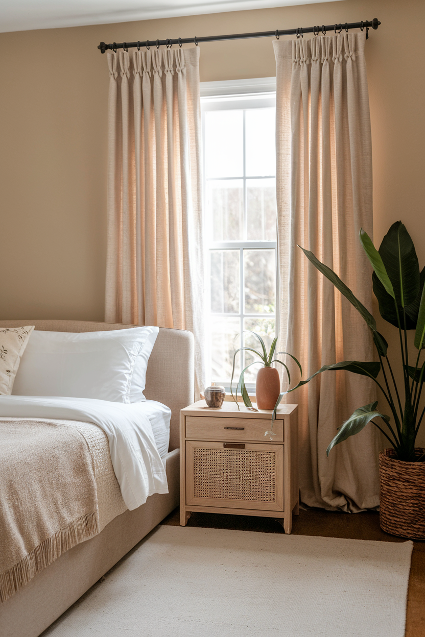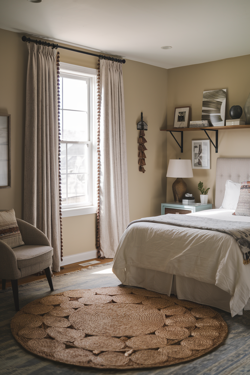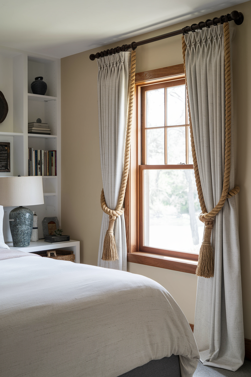 Rope tiebacks are a simple yet effective way to add character to your bedroom curtains. Whether you’re going for a coastal, farmhouse, or rustic aesthetic, rope details bring a natural, textured touch that complements linen or cotton drapes beautifully. Choose thick, twisted rope for a bold statement or delicate, braided rope for a subtle accent. You can also incorporate decorative knots or seashell embellishments for added charm. The casual elegance of rope tiebacks pairs well with woven baskets, wooden furniture, and neutral color palettes, making them a great addition to a relaxed, nature-inspired bedroom.