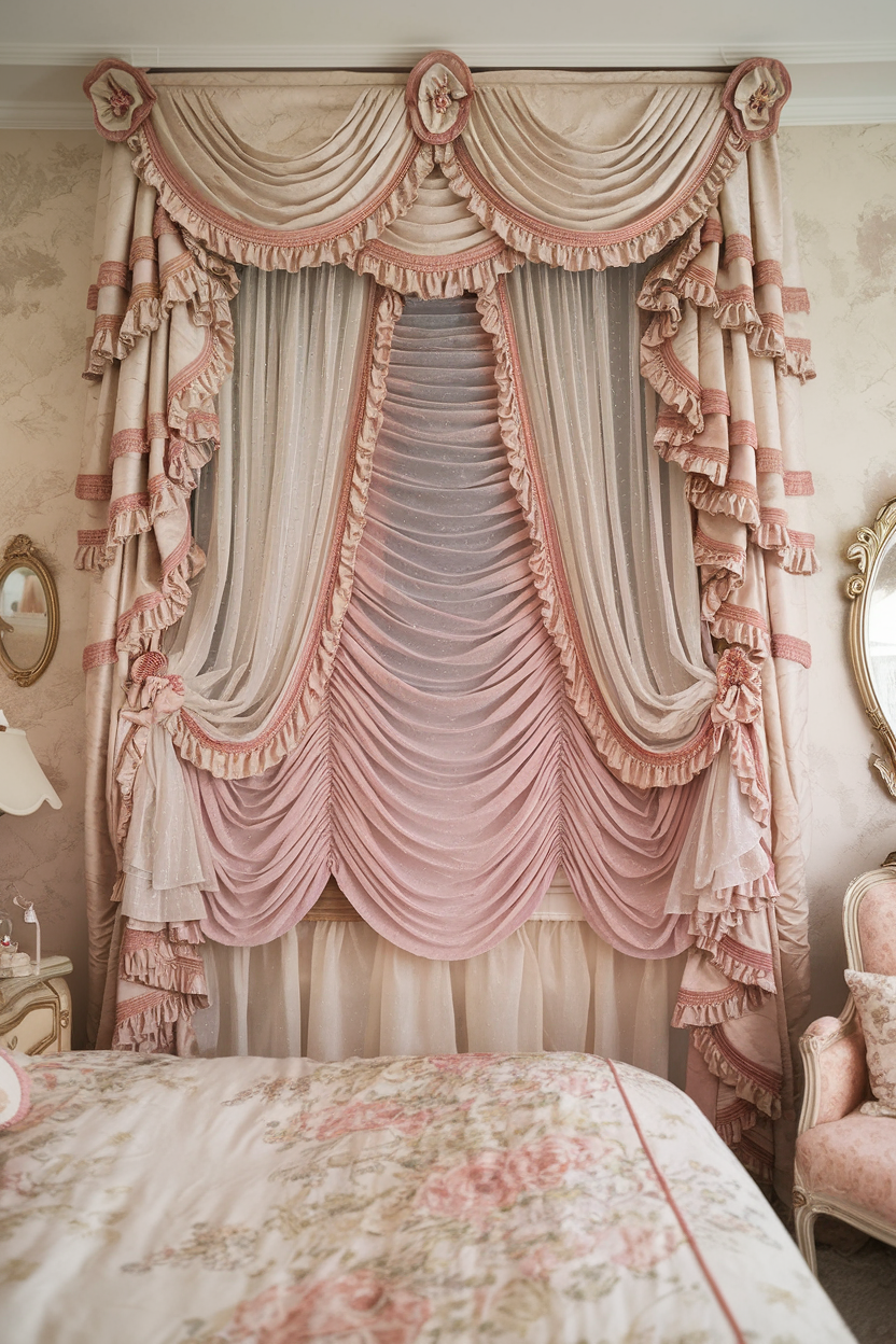 Ruffled curtains add a touch of elegance and femininity to any bedroom, making the space feel more inviting and dreamy. These curtains are often made of lightweight fabrics like chiffon, voile, or soft cotton, allowing them to drape beautifully and create a delicate, flowing effect. Ruffled curtains are perfect for shabby chic, bohemian, or French country-style bedrooms, where their soft texture enhances the overall coziness. Opt for subtle ruffles along the edges for a sophisticated look, or go for tiered ruffles for a more dramatic, statement-making style. Soft pastel hues, floral prints, or neutral tones work best for creating a harmonious, romantic aesthetic.