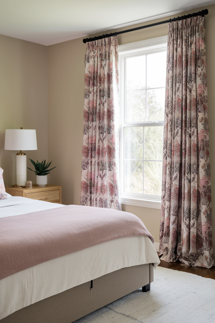 If you love color and personality in your bedroom, patterned curtains are a fantastic way to add visual interest. Floral prints, geometric designs, or abstract motifs can instantly transform a space, making it feel lively and dynamic. For a modern aesthetic, opt for simple, clean patterns in black and white or neutral tones. If you prefer a more eclectic or maximalist look, go for vibrant colors and intricate designs. The key to styling patterned curtains is balance. Keep the rest of the room’s decor relatively neutral so that the curtains remain the focal point.