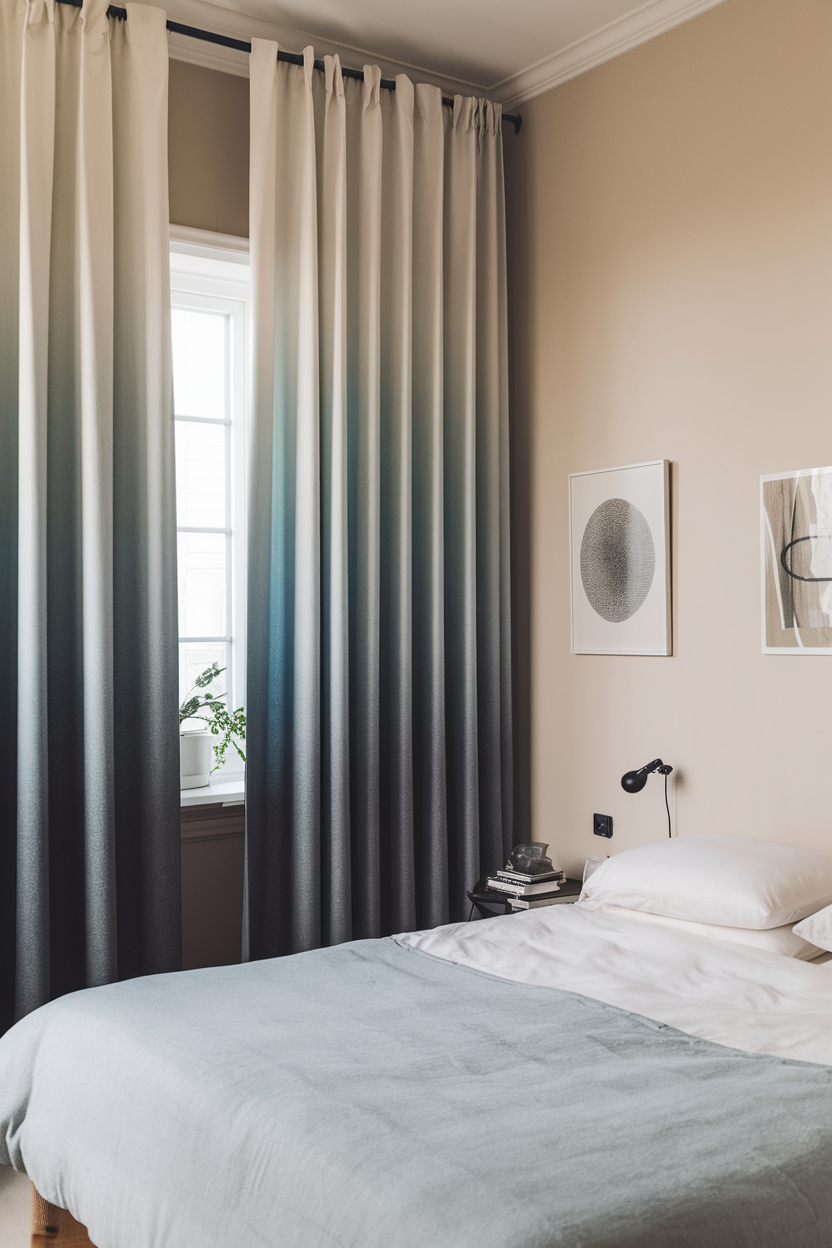 Ombre curtains, with their gradual color transition from light to dark, create a mesmerizing effect that adds depth and dimension to your bedroom. This design is perfect for those who love a modern, artistic look but don’t want anything too overpowering. Soft pastel ombre curtains, like blush pink fading into white or sky blue blending into gray, offer a delicate, soothing ambiance. For a bolder approach, go for jewel-toned ombre curtains with rich gradients like deep teal transitioning to turquoise or burnt orange shifting into beige. These curtains pair beautifully with minimalist decor, allowing them to be the main visual attraction in the room.