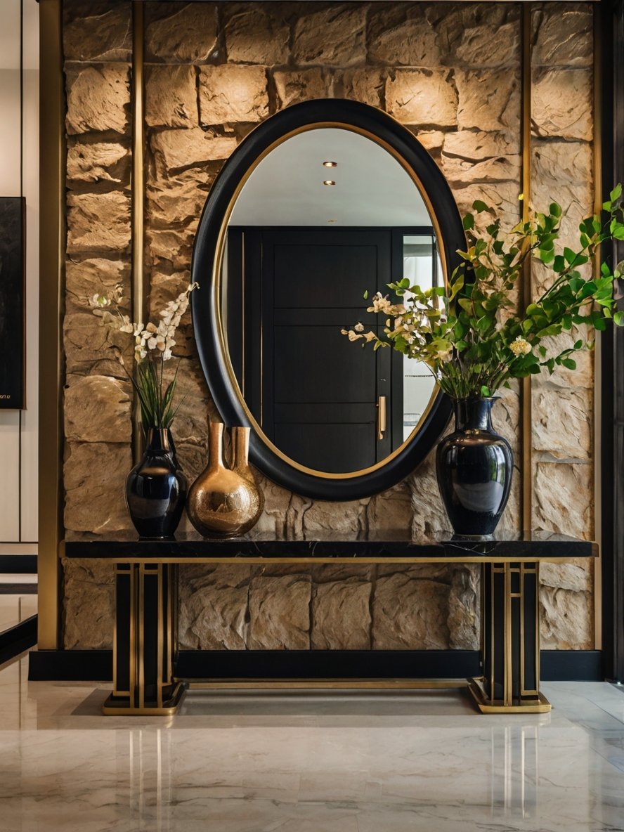 This striking entryway is a perfect balance of natural textures and modern sophistication. The textured stone wall creates a warm and inviting contrast to the sleek black and gold accents, setting the tone for a space that feels both refined and welcoming. A bold oval mirror with a black and gold frame anchors the design, reflecting light and adding depth to the composition. The marble-top console table, with its geometric gold detailing, serves as a stunning foundation for a curated selection of decorative vases and fresh greenery. Every element is meticulously arranged, transforming this foyer into an artful display of luxury and impeccable taste.