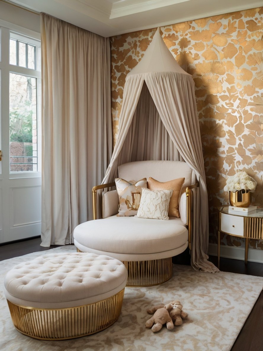 Every inch of this luxurious space is designed to exude comfort and refinement. The oversized round lounge chair, framed in gold and topped with elegant pillows, creates an inviting place to unwind. A sheer canopy drapes overhead, adding a whimsical, storybook-like charm, while the textured gold floral wallpaper serves as a stunning backdrop. The matching ottoman, plush area rug, and stylish side table enhance the softness of the space, making it an ideal setting for moments of relaxation. Whether used as a reading nook or a peaceful retreat, this space offers a perfect blend of coziness and high-end sophistication.