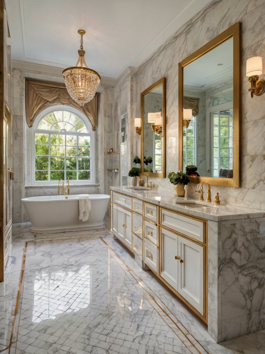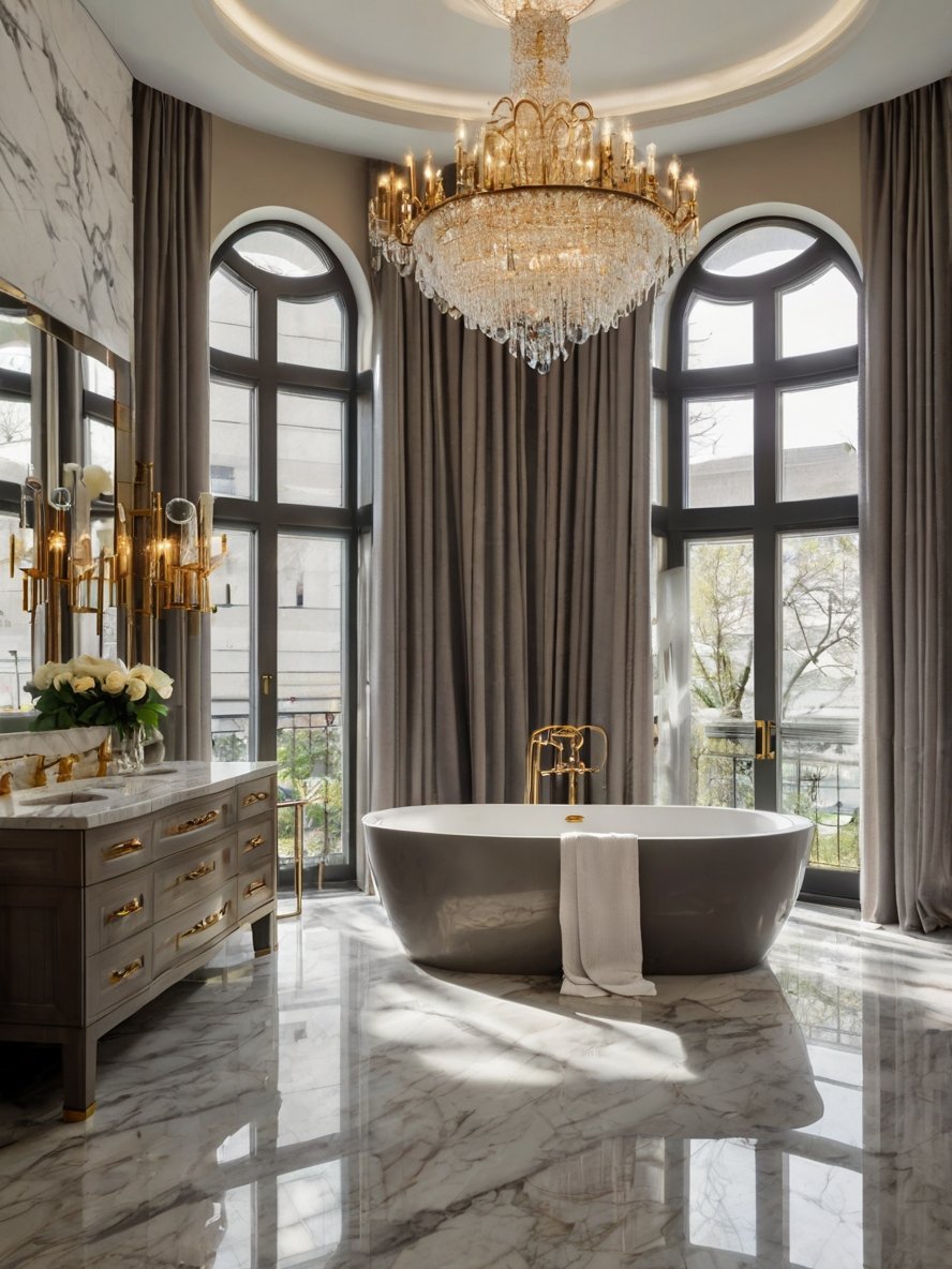 This bathroom is a masterpiece of elegance, where timeless materials and impeccable design create an atmosphere of pure indulgence. The polished marble flooring, with its delicate gold inlays, reflects the natural light streaming in from the grand arched window. A magnificent crystal chandelier hangs overhead, casting a warm glow that enhances the room’s refined ambiance. The freestanding soaking tub, framed by opulent drapery, invites moments of relaxation, while the dual vanity, adorned with gold-trimmed mirrors, exudes classic sophistication. Every detail, from the gilded faucets to the soft lighting, transforms this space into a private spa retreat fit for royalty.