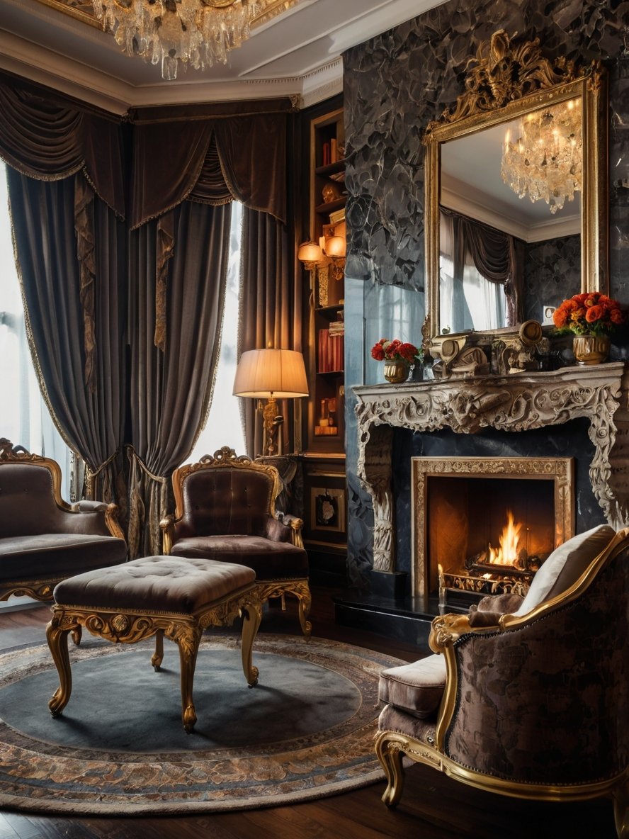 This breathtaking living space is an homage to classical European elegance, where lavish details create an atmosphere of regal sophistication. The antique-inspired seating, wrapped in plush velvet and gilded in gold, offers both comfort and grandeur. A roaring fireplace, set beneath an intricately carved marble mantel, casts a warm and inviting glow, making the room feel like a stately retreat. Above, an opulent chandelier drips with crystal, reflecting light across the dark, textured walls. Ornate drapery cascades from the towering windows, adding to the rich ambiance. Every inch of this space is designed to transport you to a world of aristocratic charm, where luxury and tradition meet in perfect harmony.