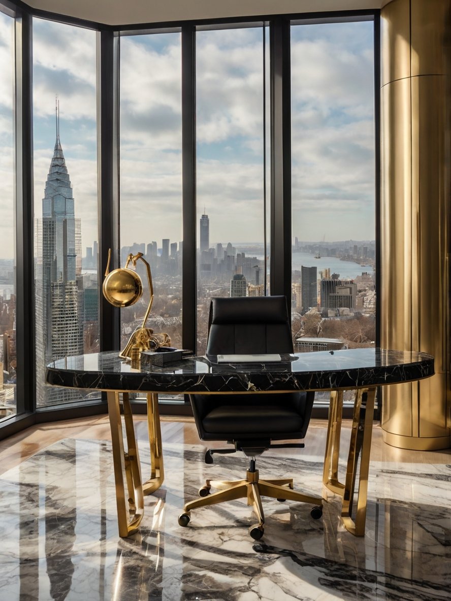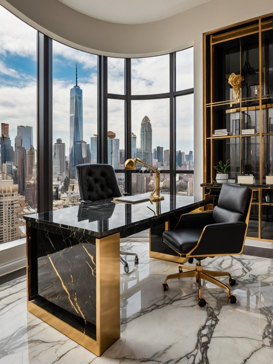 This office is more than just a workspace, it’s a statement of power, prestige, and refined taste. Perched high above the city with sweeping panoramic views, this space seamlessly combines luxury and productivity. The black marble desk, framed in gleaming gold, stands as a commanding centerpiece, exuding both sophistication and strength. A sleek black leather chair adds an executive touch, while the polished marble floors reflect the natural light pouring in through the expansive floor-to-ceiling windows. Every detail, from the sculptural gold lamp to the rich textures of the materials, is meticulously curated to create an atmosphere of inspiration and success. This is the ultimate office for those who aim high and settle for nothing less than extraordinary.