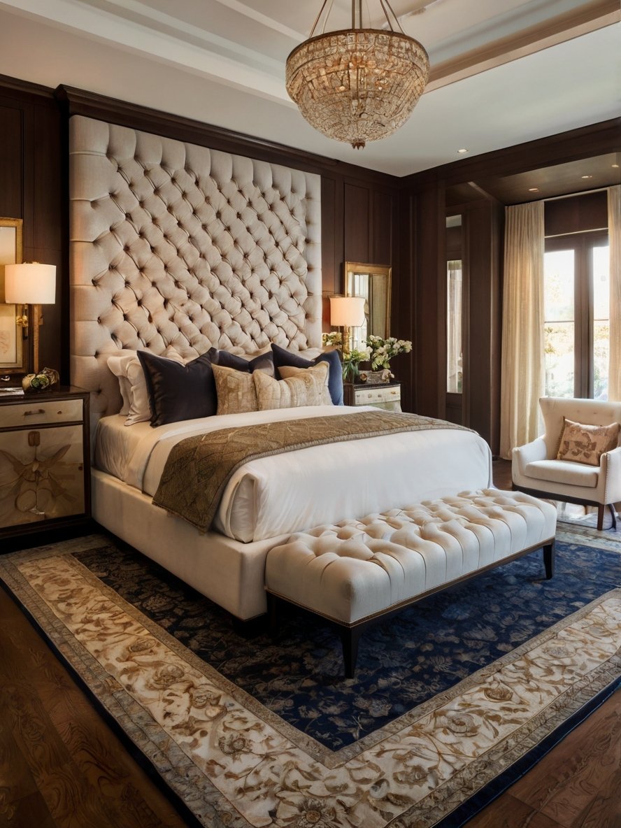 This bedroom is an absolute masterpiece of luxury and comfort, designed for those who appreciate the finer things in life. The dramatic tufted headboard, stretching toward the ceiling, creates an air of sophistication, while the soft bedding and decorative pillows invite relaxation. The blue and gold area rug adds depth and richness, complementing the warm wood paneling and shimmering crystal chandelier. Thoughtful design touches, such as the plush bench and elegant armchair, make the space both functional and stylish. Whether basking in the natural light from the grand windows or enjoying the soft glow of the bedside lamps, this bedroom is a true retreat from the outside world.