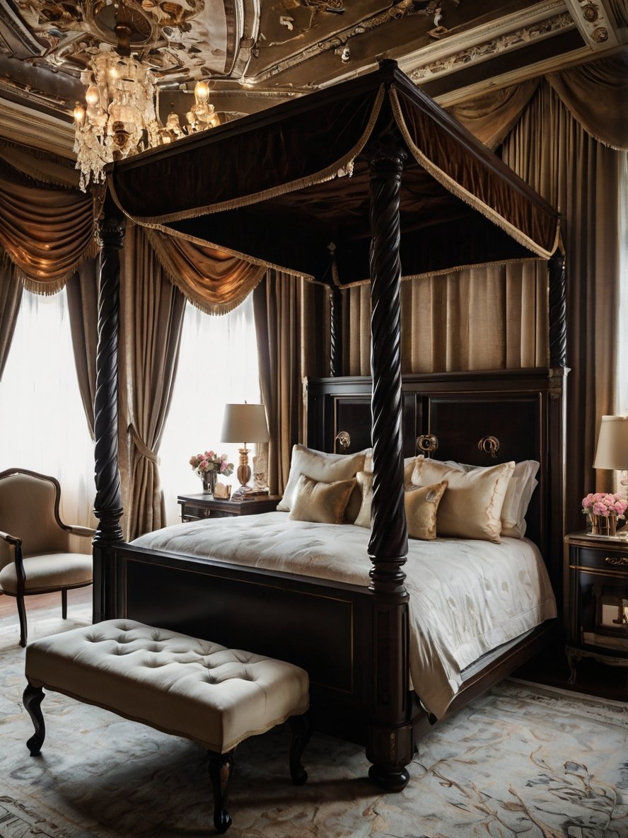 This bedroom is a stunning homage to classical elegance, where every detail reflects a deep appreciation for luxury and tradition. The carved four-poster bed, with its rich wood tones and sumptuous canopy, anchors the space with undeniable grandeur. A magnificent chandelier dangles from an elaborately designed ceiling, casting a soft glow over the lush fabrics and refined decor. The golden drapery, plush bedding, and intricate detailing on the furniture create a warm yet majestic ambiance. With a perfect balance of regal charm and cozy indulgence, this bedroom offers a dreamlike escape into a world of aristocratic splendor.