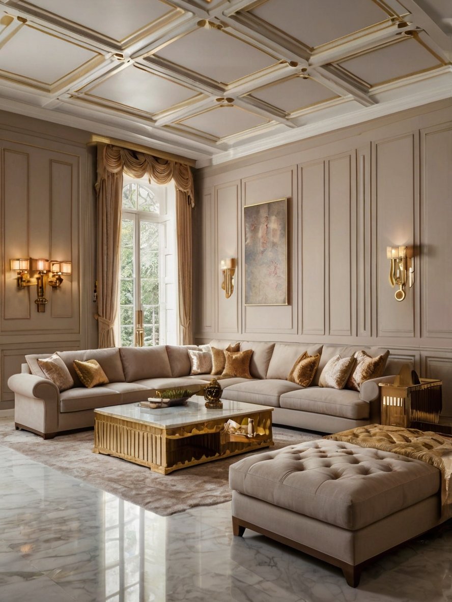 This living room strikes the perfect balance between grandeur and comfort, with its plush sectional sofa and intricate architectural details. The gold accents found in the pillows, coffee table, and light fixtures bring a touch of glamour, while the neutral palette keeps the space feeling soft and inviting. The marble flooring adds a polished, timeless appeal, beautifully reflecting the natural light that pours in through the elegant arched window. The coffered ceiling, detailed with gold trim, adds depth and dimension to the room, making it feel even more expansive. Whether used for entertaining guests or quiet evenings, this space is designed for sophisticated living.