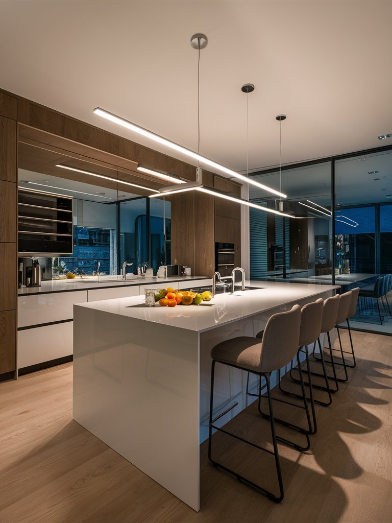 This kitchen is a masterpiece of modern elegance, meticulously crafted for those who appreciate both aesthetics and efficiency. The stunning waterfall island, bathed in soft ambient lighting, serves as the perfect hub for casual dining or entertaining guests. The contrast between the sleek white surfaces and warm wooden cabinetry creates a dynamic visual balance, while the mirrored backsplash subtly enhances the sense of space. The linear pendant lights add a contemporary touch, elevating the overall design to an architectural statement. Every element, from the integrated appliances to the plush seating, is designed to exude sophistication, making this kitchen a true reflection of luxury living.