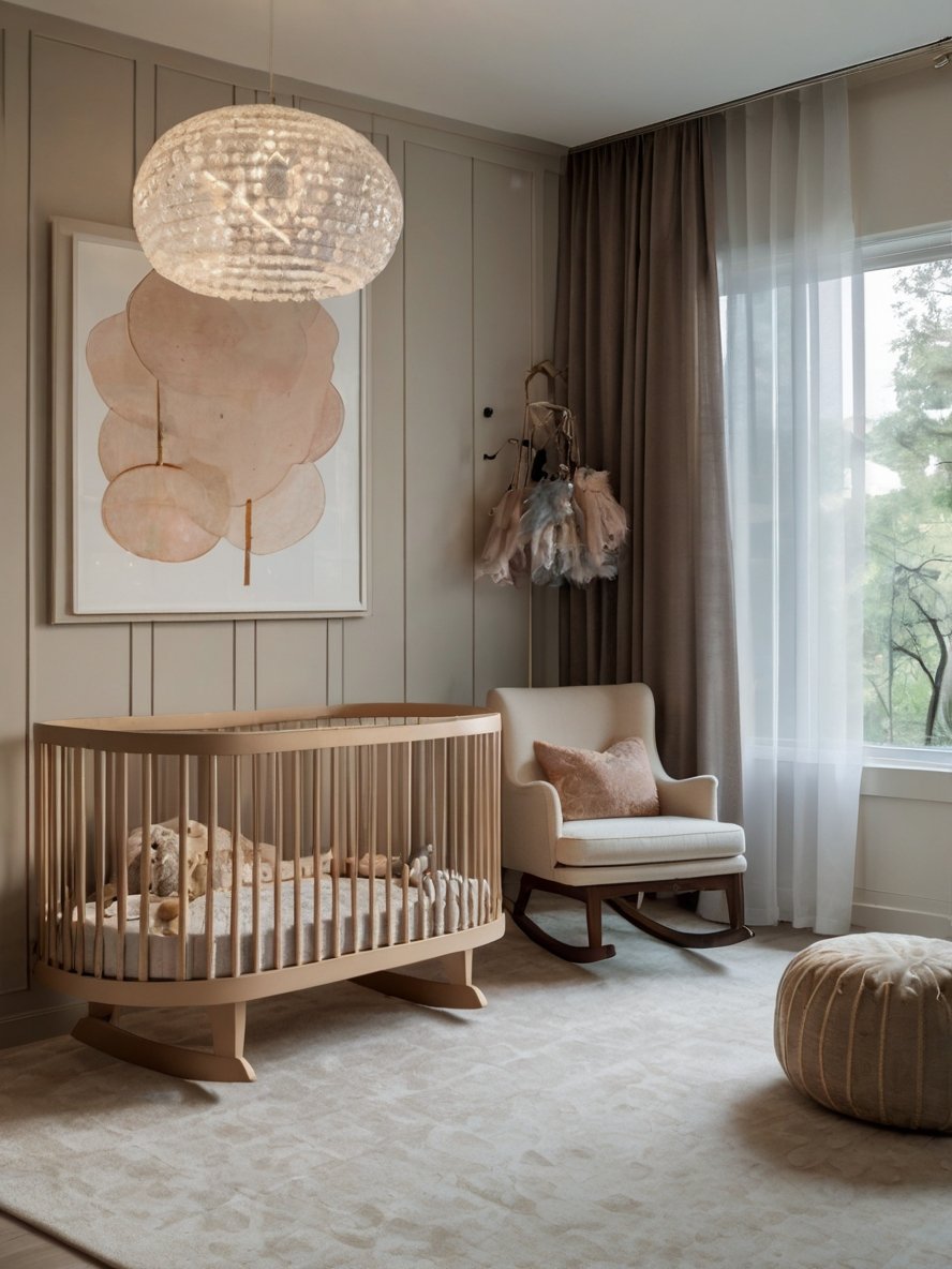 Soft, calming, and beautifully curated, this nursery is a perfect example of how minimalism can feel warm and inviting. The modern wooden crib, with its gentle curves and natural finish, is a striking yet subtle focal point. A cozy rocking chair, paired with a delicate blush pillow, provides a soothing space for parents and baby alike. The muted tones of the walls and furnishings create a peaceful backdrop, enhanced by soft drapery that filters in natural light. A whimsical pendant light adds a touch of playful elegance, casting a soft glow over the space. Thoughtful design meets ultimate comfort in this nursery, creating a cozy haven where every moment feels special.
