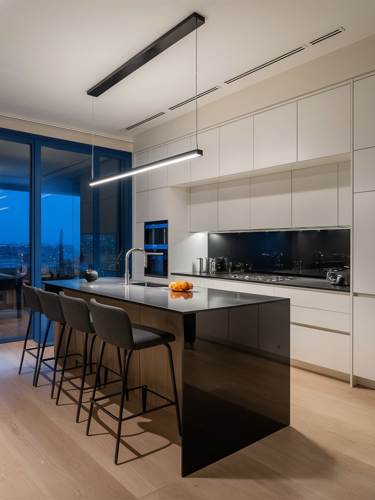 This stunning kitchen embraces contrast in the most elegant way. The high-gloss black island, featuring a sleek waterfall countertop, commands attention while seamlessly integrating with the neutral cabinetry and soft wood flooring. Dark barstools complement the island’s bold aesthetic, creating a sophisticated dining and gathering space. The minimalist pendant lighting, suspended above, enhances the room’s contemporary feel without overwhelming the clean design. A glass wall opens up to panoramic city views, flooding the space with natural light and adding to its high-end appeal. Every element is carefully curated to achieve a kitchen that is both striking and effortlessly functional.