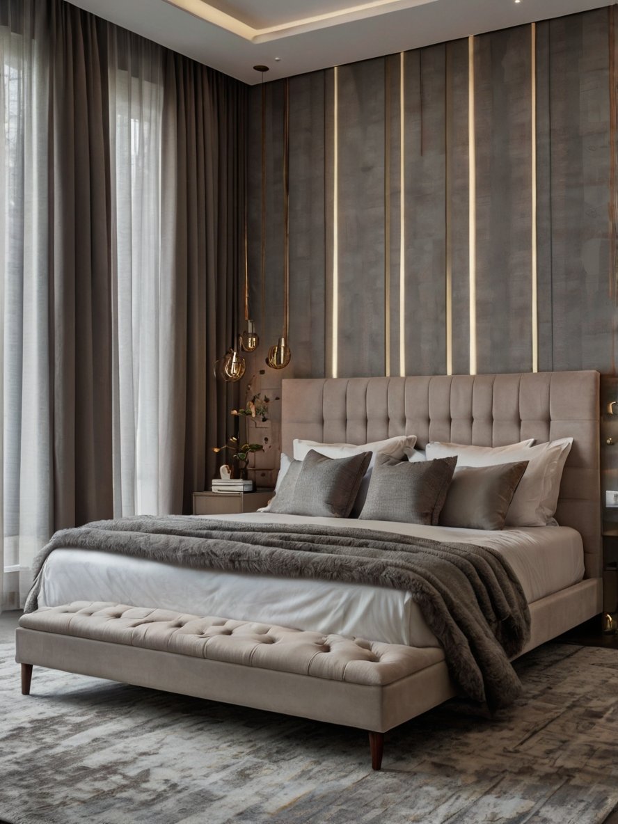 This bedroom is the definition of modern luxury, where soft textures and muted tones create a space that feels effortlessly serene. The plush upholstered bed, dressed in layers of cozy fabrics and neutral-toned pillows, invites relaxation, while the tufted bench at the foot adds both functionality and sophistication. The striking feature wall, with vertical gold inlays, adds depth and refinement, making the space feel even more elegant. Floor-to-ceiling drapery enhances the room’s intimate ambiance, filtering natural light to create a soft, warm glow. Every detail, from the statement pendant lighting to the chic bedside decor, works in harmony to create a retreat designed for ultimate comfort and indulgence.