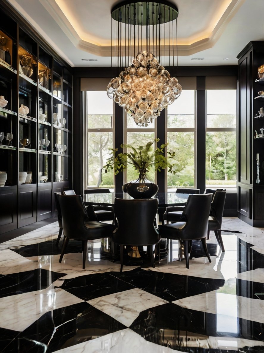 This dining area is a stunning example of bold sophistication, where rich black tones meet the timeless beauty of marble. The striking geometric flooring, a blend of high-gloss black and white marble, sets the stage for an opulent yet modern design. The sleek black dining chairs and round table create an intimate yet dramatic setting, framed by floor-to-ceiling windows that flood the space with natural light. The built-in cabinetry, displaying fine glassware and decorative pieces, adds an air of refinement. Hanging above it all, a breathtaking sculptural chandelier, made of clustered glass orbs, casts a warm and luxurious glow. This space is designed for unforgettable dining experiences in an atmosphere of pure sophistication.
