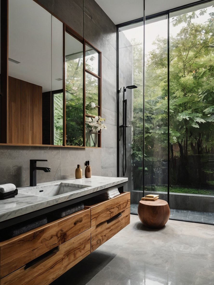 This bathroom is a stunning interplay of contemporary design and organic elements, offering a retreat that feels both luxurious and deeply connected to nature. The floor-to-ceiling glass walls blur the boundaries between indoors and outdoors, allowing natural light to flood the space while providing a breathtaking view of lush greenery. The floating wooden vanity, with its sleek marble surface and seamless storage, exudes understated elegance. The minimalist black fixtures add a bold contrast, enhancing the modern aesthetic. With a rainfall shower positioned against a backdrop of glass and greenery, this bathroom transforms daily routines into a meditative escape. It’s a true sanctuary where design and nature exist in perfect harmony.