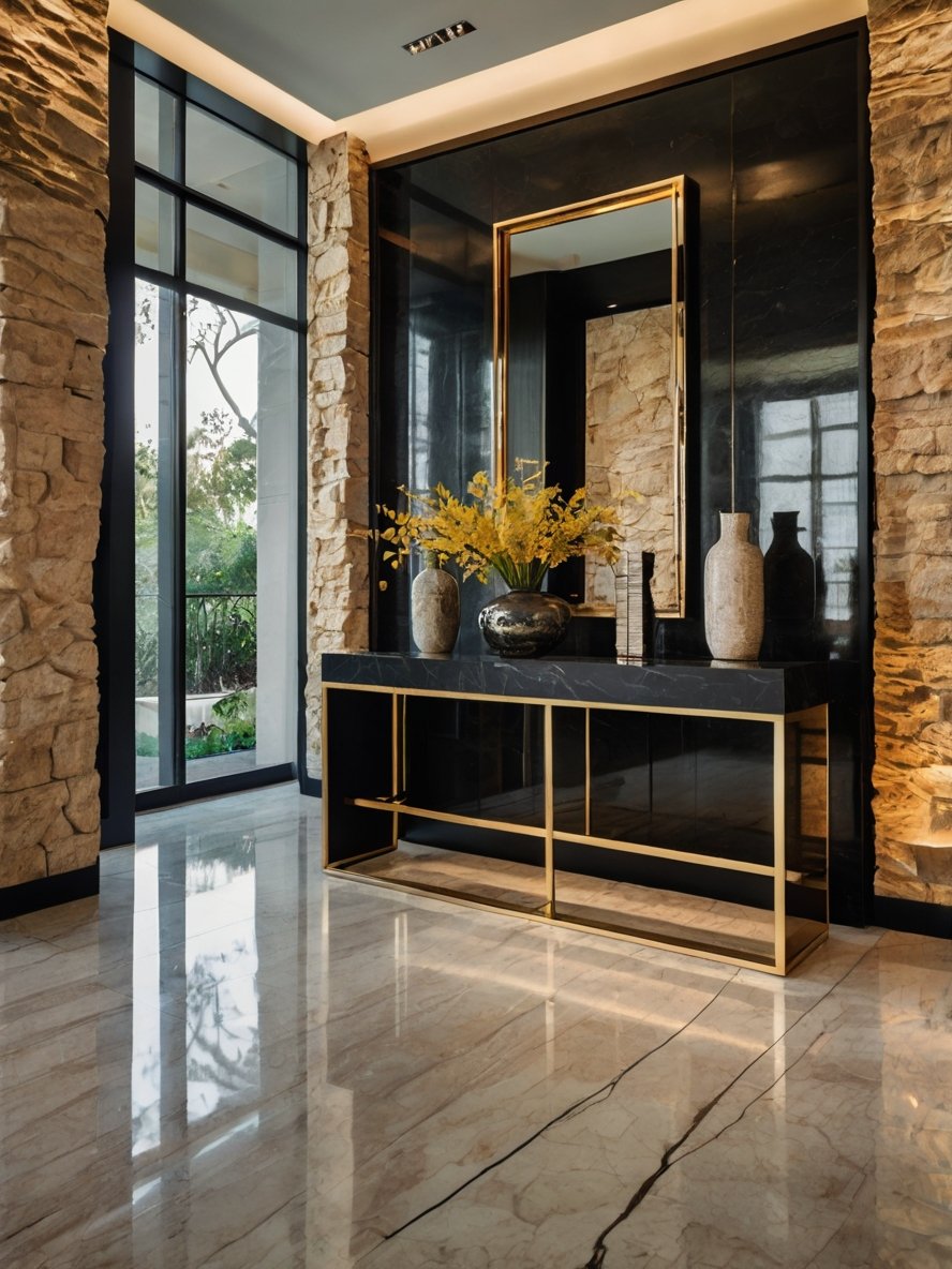 Walking into this entryway is like stepping into a work of art. The rich contrast between rugged stone and sleek black marble creates a space that is both bold and timeless. A stunning gold-framed mirror serves as the perfect focal point, adding depth and reflecting the space’s sophisticated elements. The black and gold console table, with its minimalist frame and luxurious marble top, elevates the aesthetic, offering both function and style. The carefully placed decorative vases and fresh floral arrangements soften the strong architectural lines, ensuring the space remains warm and inviting. This is an entryway that not only welcomes guests but also leaves a lasting impression of impeccable taste.