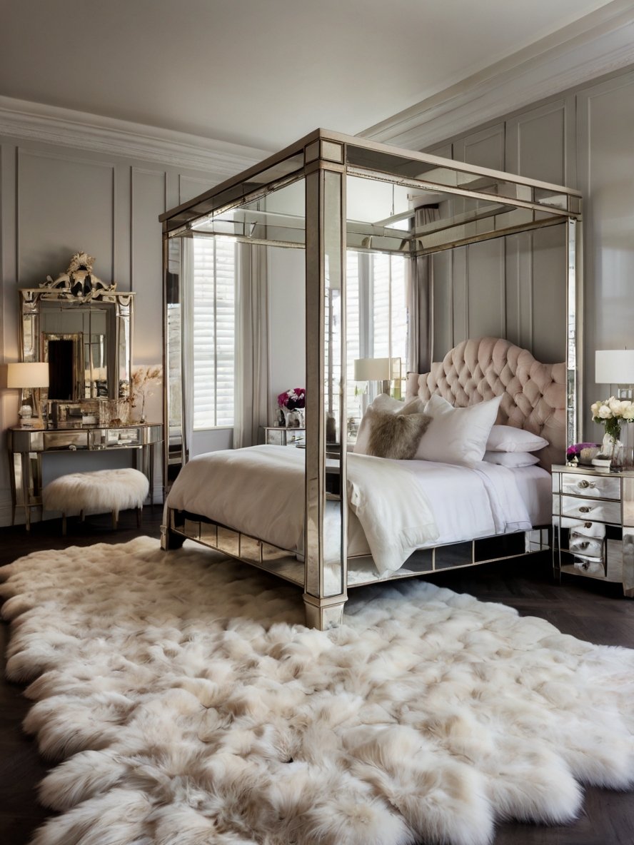 This bedroom is a visual masterpiece, exuding a glamorous aesthetic that feels both timeless and contemporary. The dazzling mirrored four-poster bed commands attention, reflecting the elegance of the surrounding space. Paired with a tufted headboard, crisp white linens, and plush accent pillows, the bed invites you to sink into luxury. A cascading faux fur rug adds layers of texture, creating a striking contrast against the sleek mirrored surfaces. The vanity, adorned with intricate detailing, enhances the space’s regal charm. Every element of this bedroom has been meticulously designed to capture a sense of sophistication, making it a truly mesmerizing retreat.