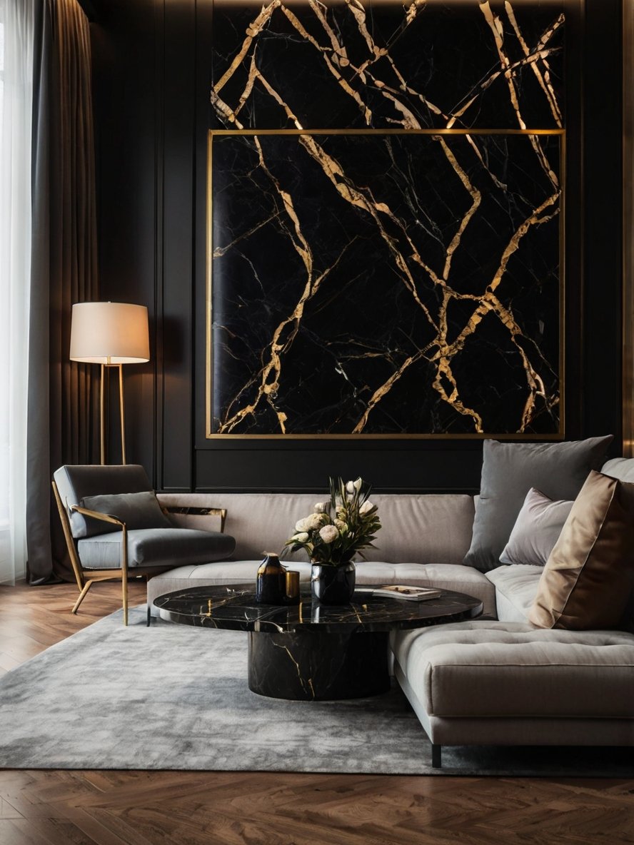 Luxury meets artistry in this breathtaking living room, where the black marble feature wall, with its intricate gold veining, serves as an undeniable showstopper. This striking design choice is complemented by a sleek marble coffee table and a plush, oversized sectional in muted neutrals, creating a perfect blend of boldness and softness. The carefully curated lighting, including an elegant floor lamp, adds warmth and depth, while the herringbone wood flooring brings in a touch of timeless charm. Whether hosting guests or enjoying a quiet evening, this space radiates modern elegance, proving that high-end design can be both dramatic and inviting.