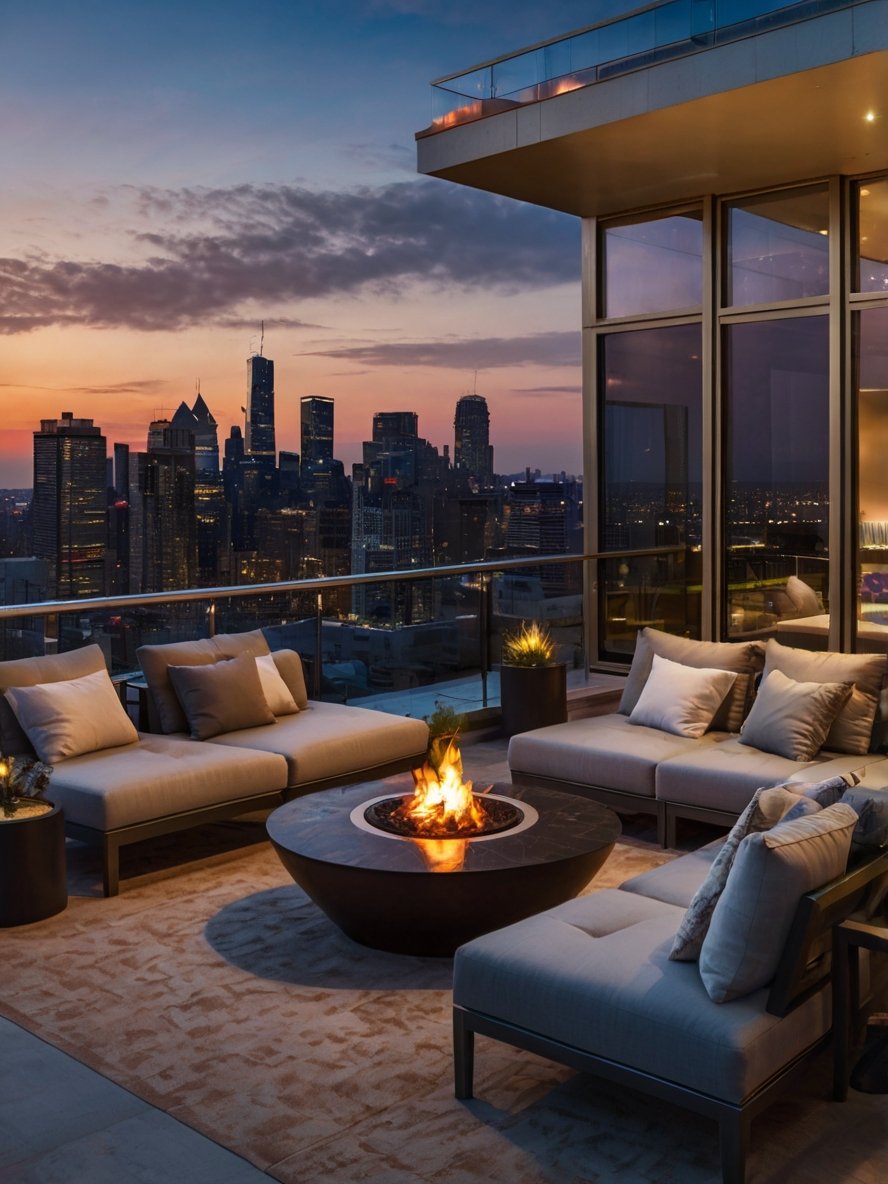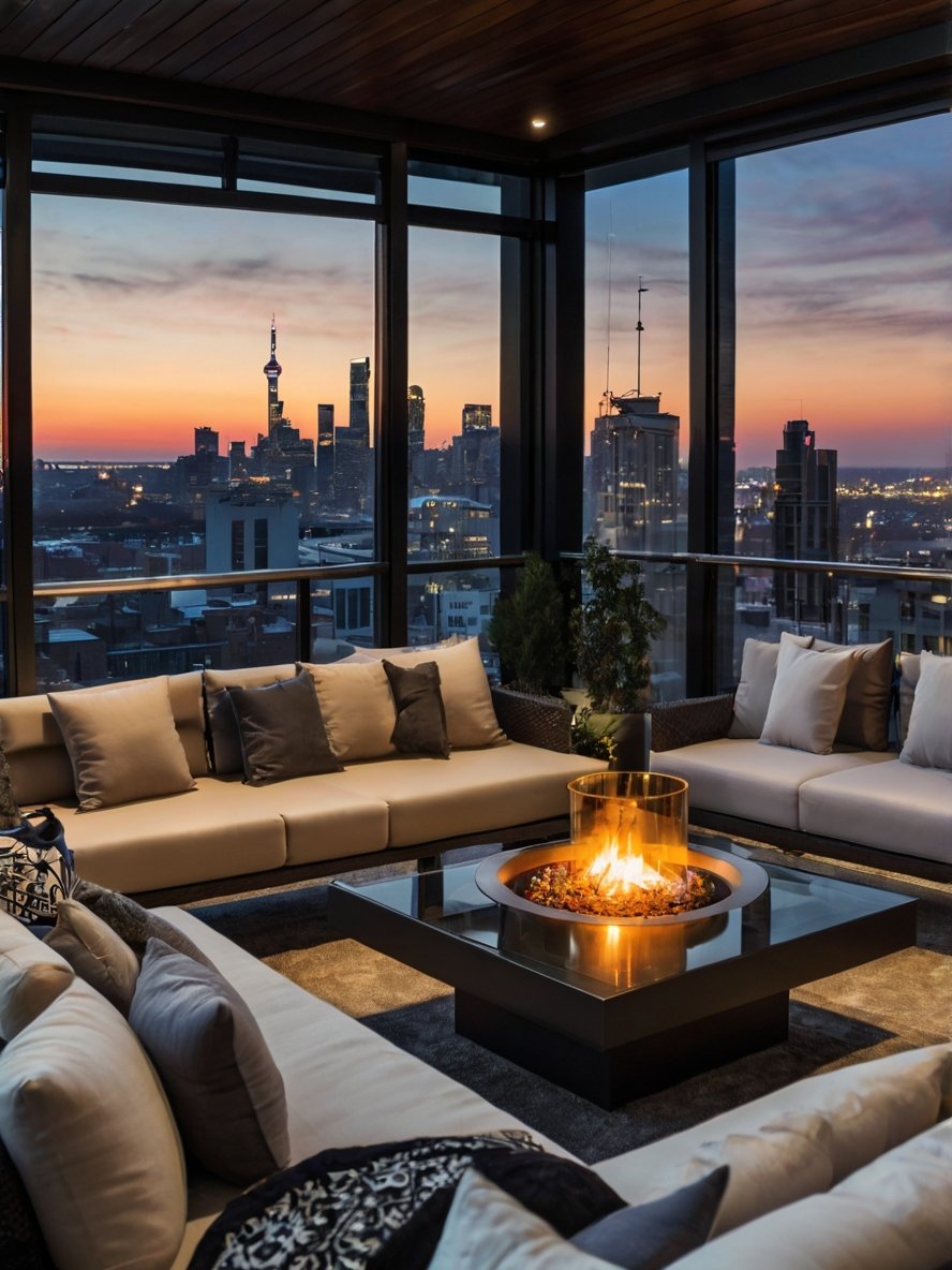 Perched high above the city, this luxurious rooftop terrace is the ultimate blend of sophistication and comfort. With plush seating arranged around a sleek fire pit, the space invites guests to unwind while taking in the breathtaking skyline. The soft glow of the flames complements the warm hues of the sunset, creating a mesmerizing ambiance that’s perfect for intimate gatherings or quiet moments of reflection. Floor-to-ceiling glass windows seamlessly connect the indoor and outdoor areas, enhancing the open, airy feel. Every detail, from the carefully placed greenery to the soft outdoor rug, adds to the elegance of this high-rise sanctuary, making it the perfect escape from the city’s fast-paced energy.