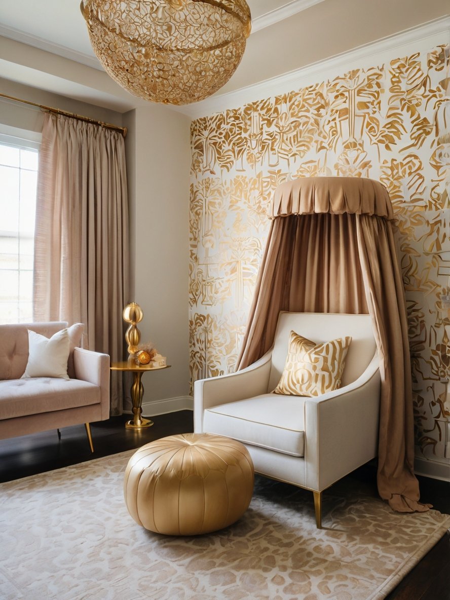 This space is designed for those who appreciate a touch of glamour without compromising on comfort. The serene color palette of ivory, blush, and gold creates a harmonious ambiance, making it the perfect retreat for relaxation. The standout canopy-draped armchair offers a regal yet cozy seat, while the metallic ottoman adds a layer of playful sophistication. The intricate gold wallpaper enhances the space’s luxury, reflecting the warm glow of the stunning chandelier above. Every detail, from the delicate gold side table to the plush area rug, is thoughtfully chosen to create an atmosphere of refined elegance. This is a room where relaxation meets timeless beauty.