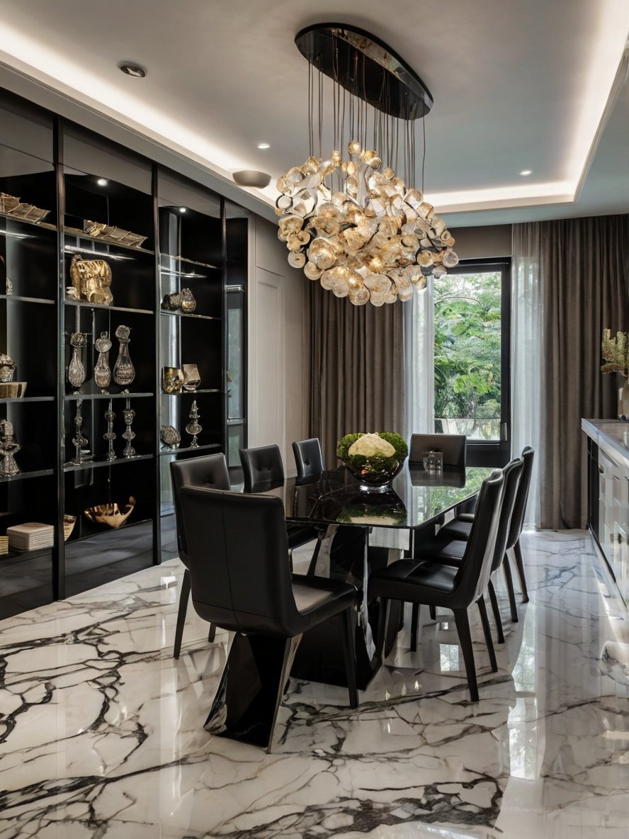 This dining space captivates with its bold, high-contrast design and striking modern details. The sleek black dining table and matching chairs create a powerful focal point, while the veined marble flooring adds movement and texture. The glass bubble chandelier above is a sculptural masterpiece, diffusing warm light that enhances the richness of the dark tones. The built-in shelving, displaying elegant glass and gold-accented pieces, adds a layer of sophistication that elevates the space. Large windows framed by soft curtains introduce a natural element, preventing the dark hues from feeling overpowering. This dining area is an invitation to indulge in both luxury and comfort, making every meal a refined experience.