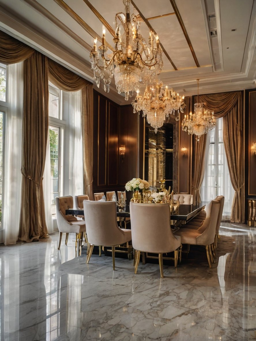 Step into a dining room that exudes pure opulence, where classic European charm meets modern refinement. The high ceilings adorned with intricate gold detailing set the stage for a breathtaking atmosphere, while crystal chandeliers illuminate the space with a warm, golden glow. Plush velvet chairs with gold legs surround a striking black dining table, creating a perfect balance of sophistication and comfort. The floor-to-ceiling windows, draped in luxurious fabric, allow natural light to enhance the polished marble flooring, reflecting the splendor of the surroundings. Whether for grand dinner parties or intimate gatherings, this dining space offers a setting fit for royalty, elevating every meal into a lavish experience.